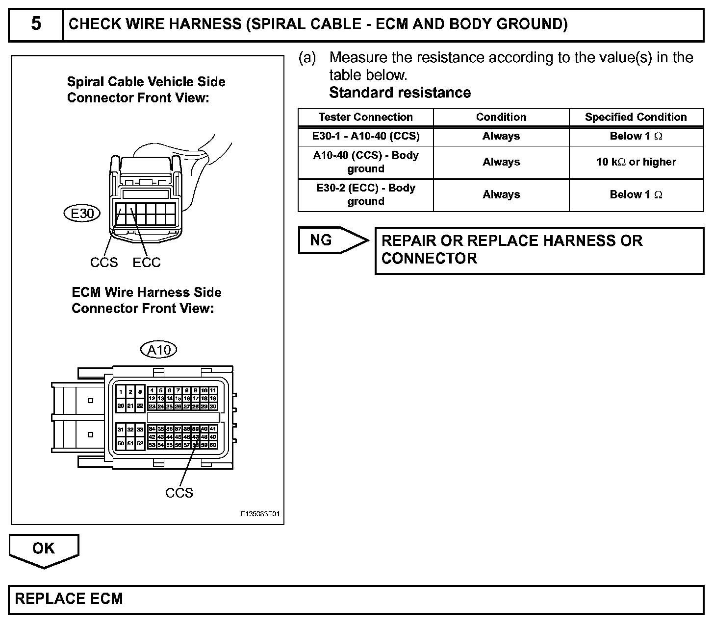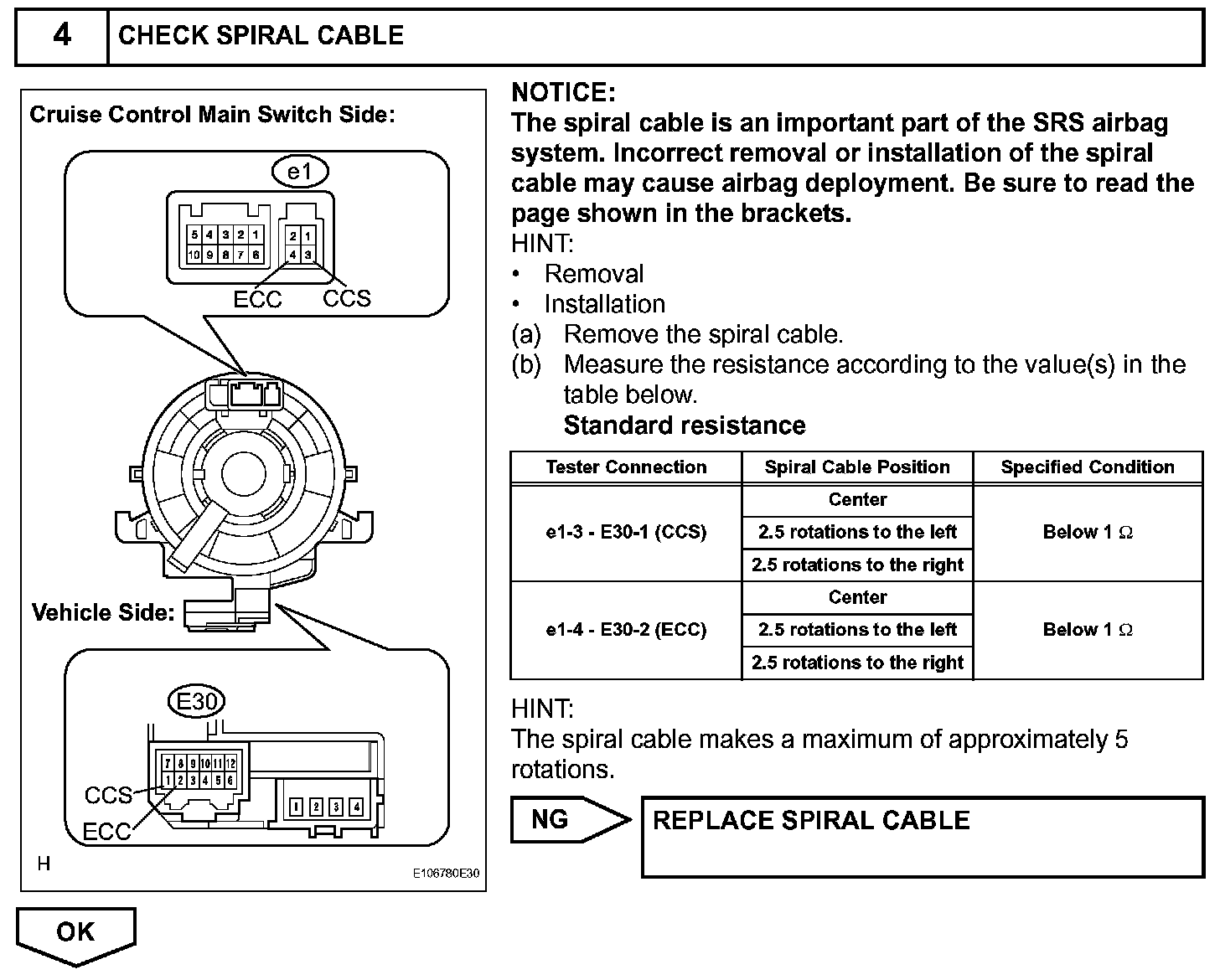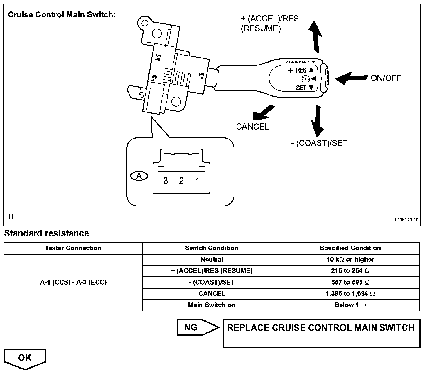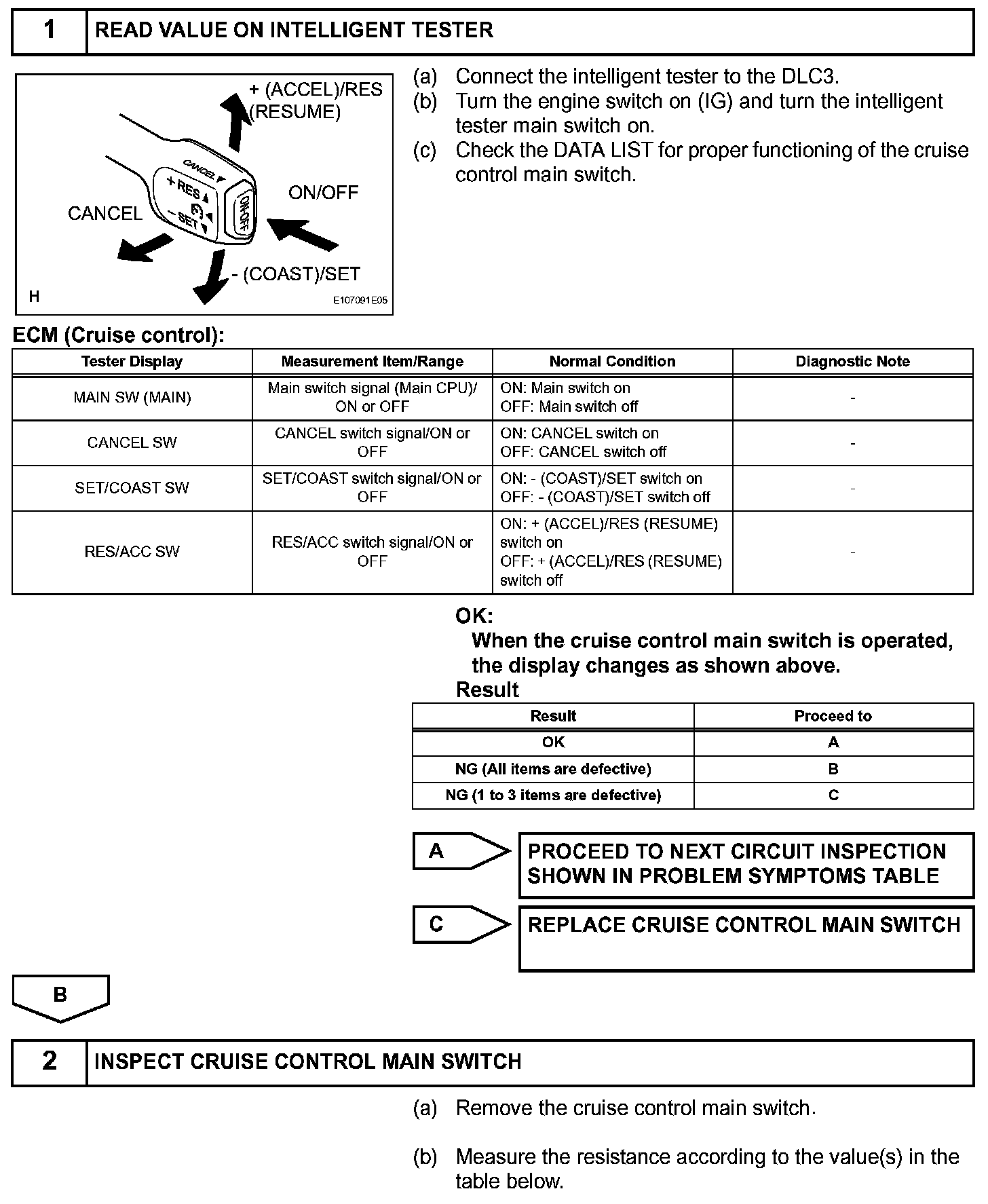 The cruise control main switch operates 7 functions: SET, - (COAST), TAP-DOWN, RES (RESUME), + (ACCEL), TAP-UP, and CANCEL. The SET, TAP-DOWN, and - (COAST) functions, and the RES (RESUME), TAP-UP, and + (ACCEL) functions are operated with the same switch. The cruise control main switch is an automatic return type switch which turns on only while operating it in the direction of each arrow and turns off after releasing it. The internal contact point of the cruise control main switch is turned on with the switch operation. Then the ECM reads the voltage value that has been changed by the switch operation to control SET, - (COAST), RES (RESUME), + (ACCEL), and CANCEL.