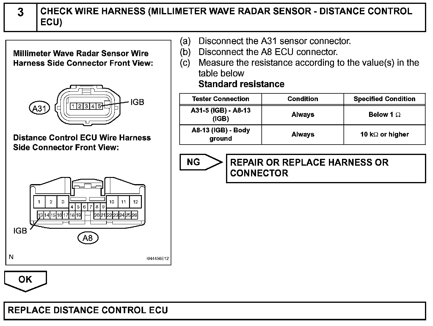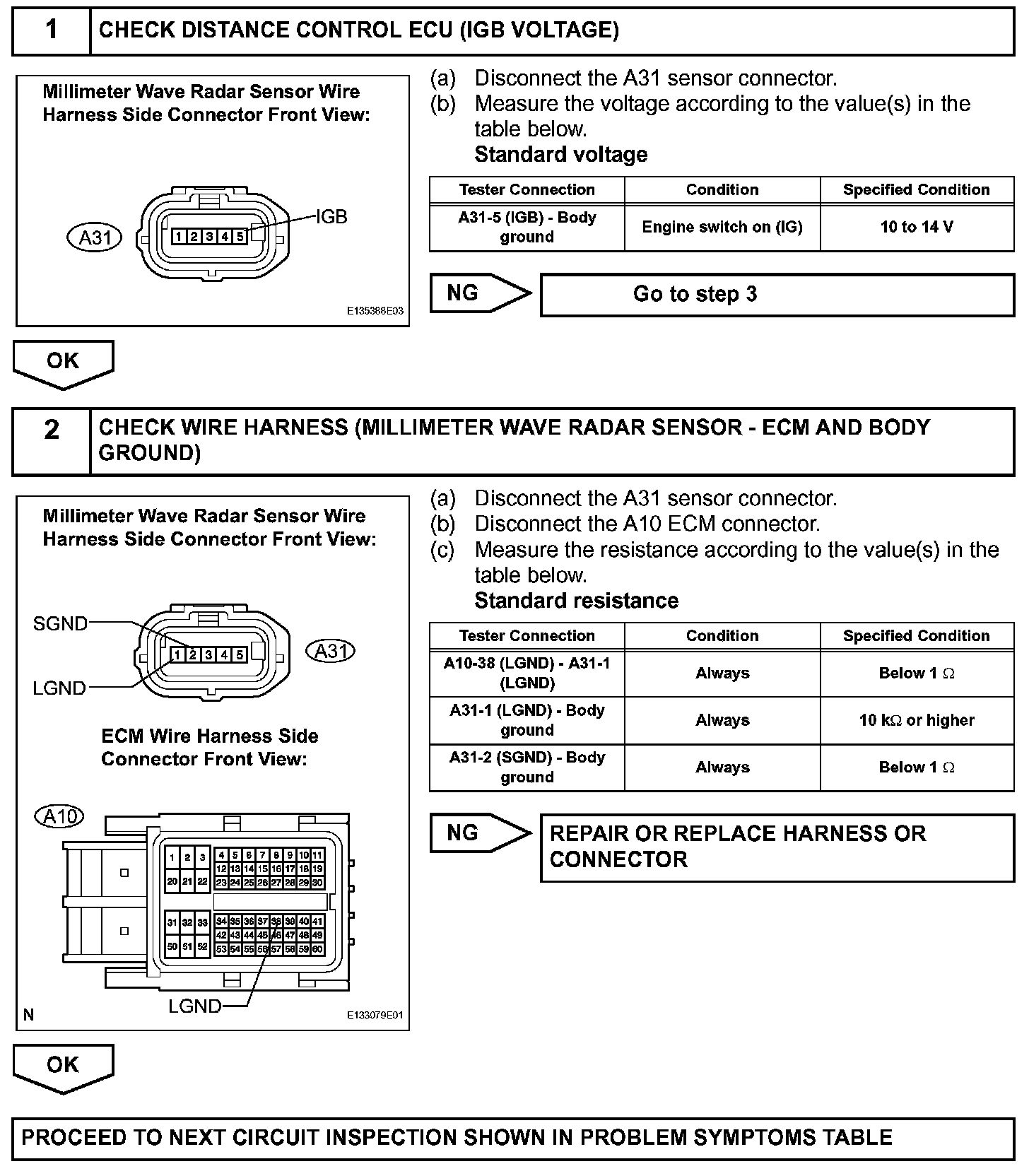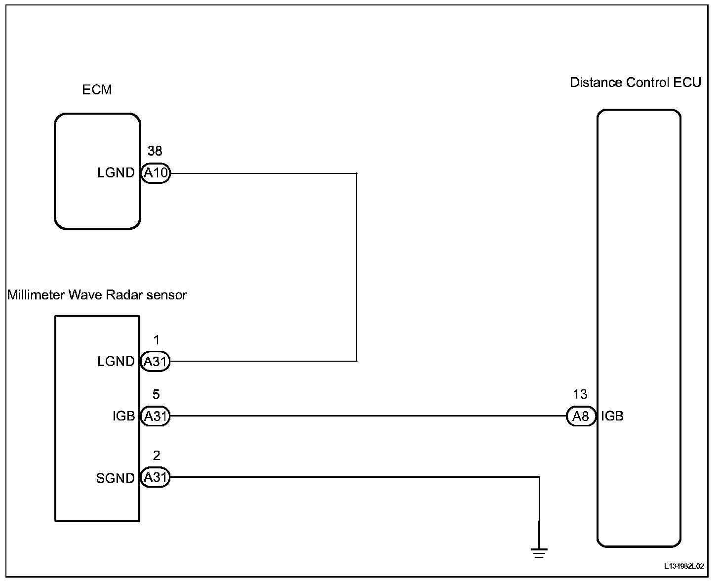 This circuit provides power to the millimeter wave radar sensor. The millimeter wave radar sensor emits radio waves towards an object in front and measures the distance and direction of the object by receiving the wave reflections. Based on the reflections, the sensor calculates the difference in speed between the vehicle and the object in front. This data is transmitted to the distance control ECU. The ECU recognizes the millimeter wave radar sensor via terminals LAND. If an open circuit occurs in the wire harness between terminals LAND, the ECM cannot recognize the millimeter wave radar sensor. The ECM will stop the control of the vehicle-to-vehicle distance control mode and only the constant speed control mode can be used.