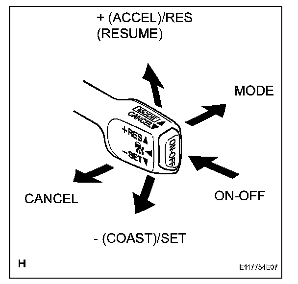 b. Check the cruise control main switch using the DATA LIST function in the intelligent tester (ON/OFF, CANCEL, - (COAST)/SET, + (ACCEL)/RES (RESUME), and MODE).