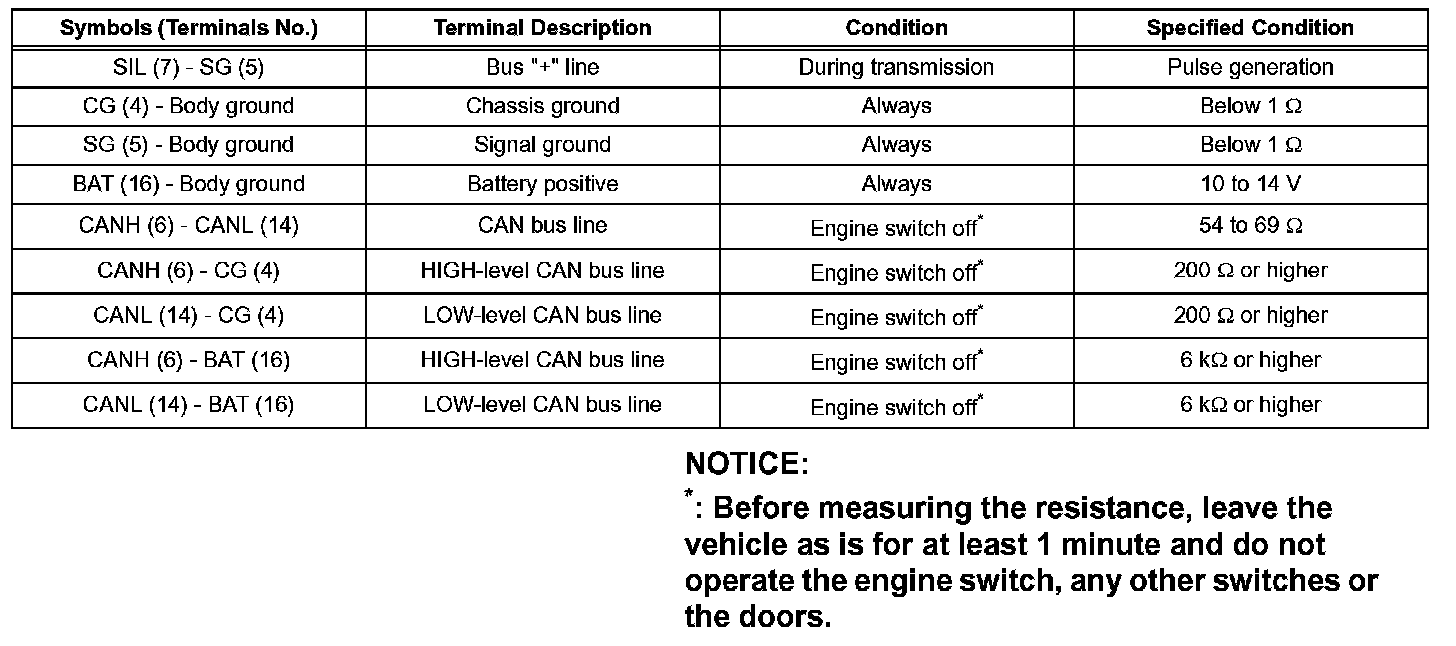 If the result is not as specified, the DLC3 may have a malfunction. Repair or replace the harness and connector.