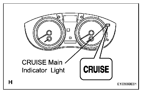 b. Check that the CRUISE main indicator light illuminates when the cruise control main switch is turned on, and that the indicator light turns off when the main switch is turned off. If the results are not as specified, inspect the CRUISE main indicator light circuit.