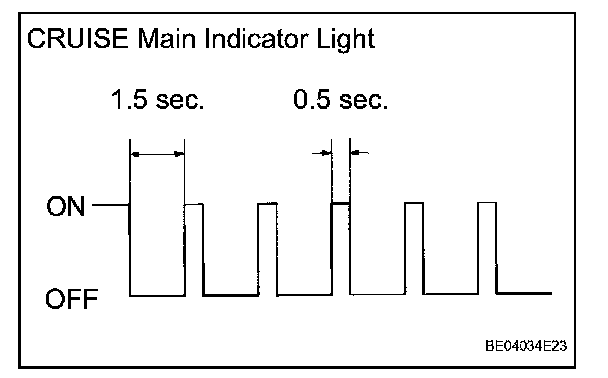 HINT: While driving with cruise control, the ECM activates AUTO CANCEL of the cruise control system when a malfunction occurs in one of the following: vehicle speed sensors, stop light switch, or other related parts. When AUTO CANCEL is activated, the CRUISE main indicator light outputs the blinking pattern given to the left. At the same time, data of the malfunction is stored as a DTC.
