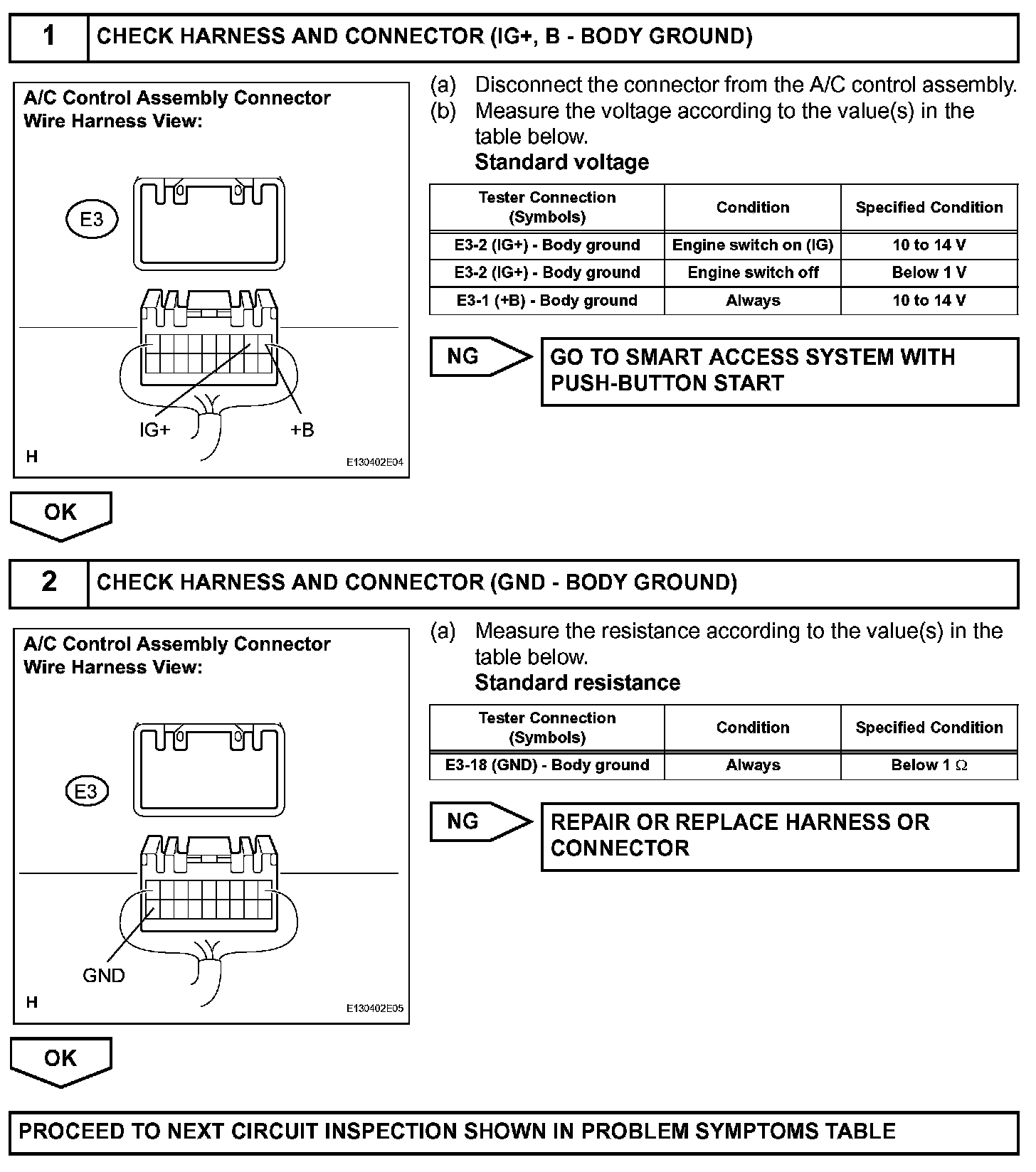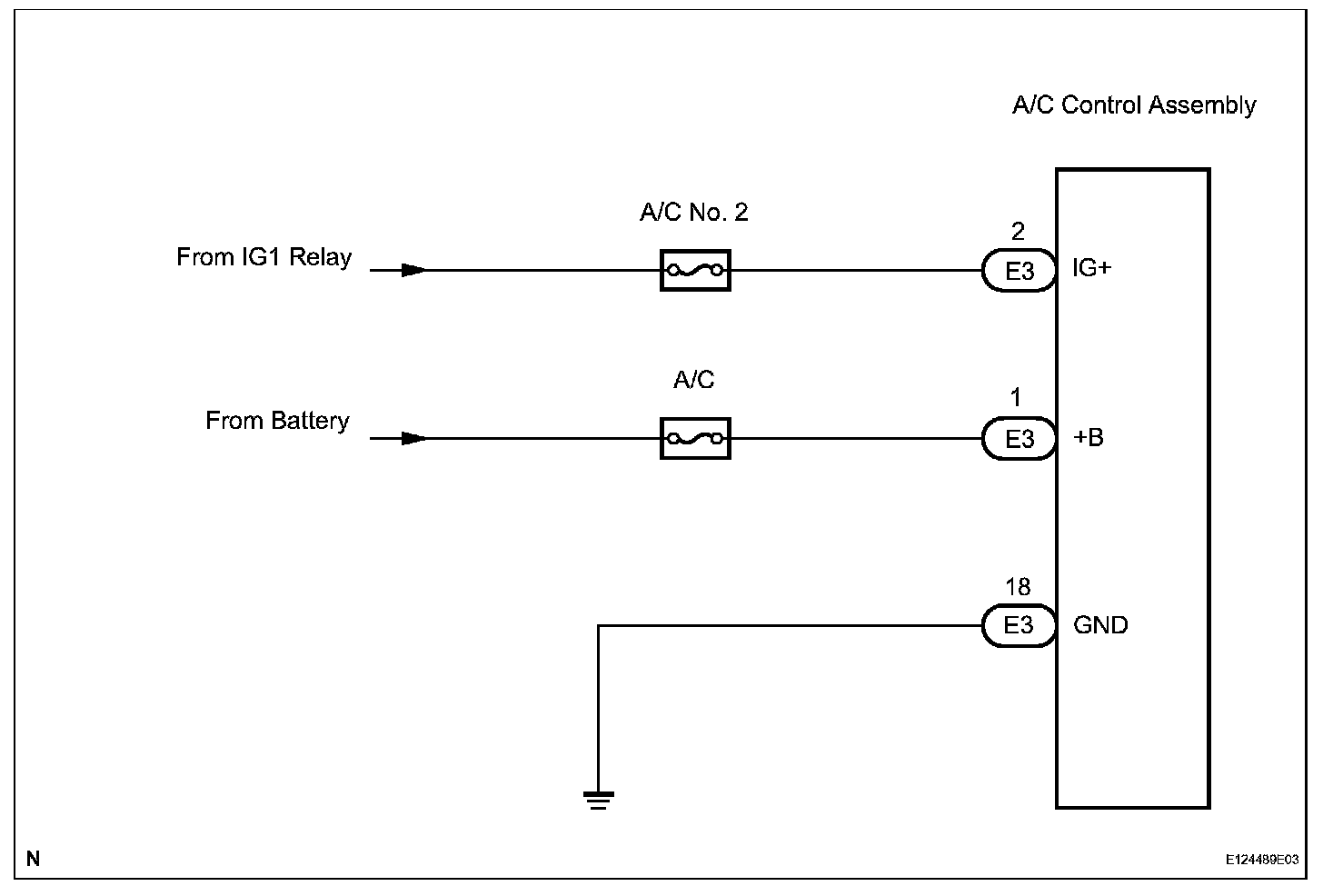 Battery voltage is supplied to the A/C control assembly through the A/C fuse and A/C No. 2 fuse.