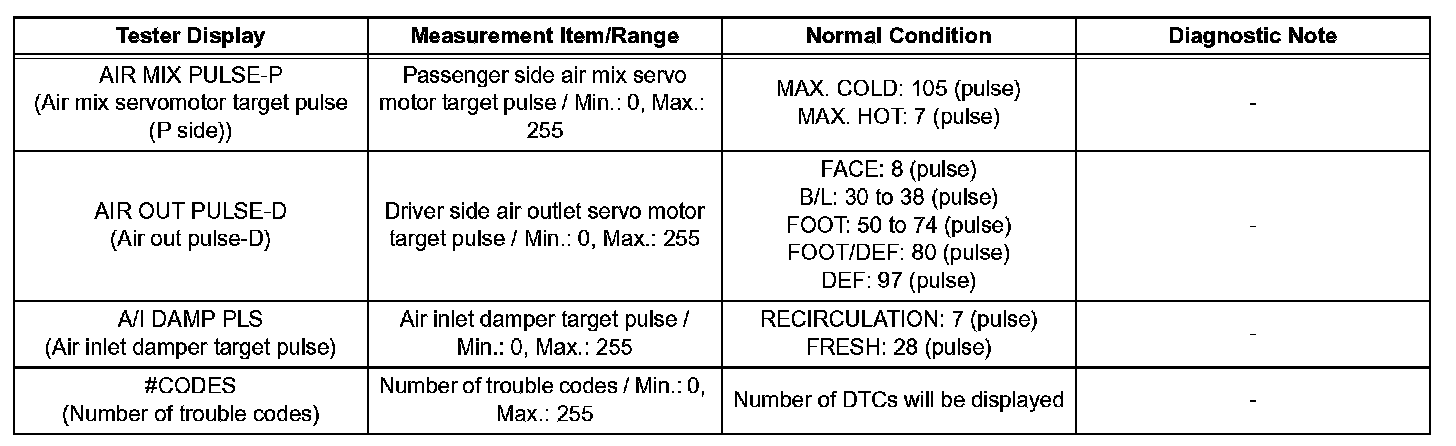 DATA LISTHINT: Using the intelligent tester's DATA LIST allows switch, sensor, actuator, and other item values to be read without removing any parts. Reading the DATA LIST early in troubleshooting is one way to save time.