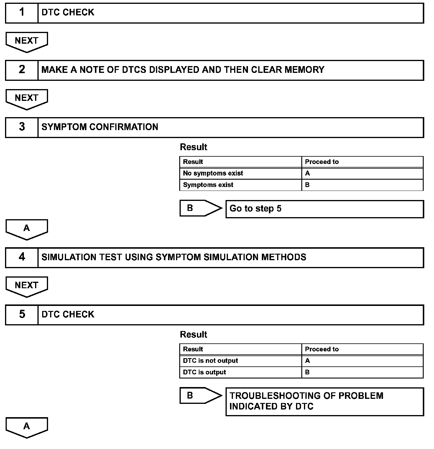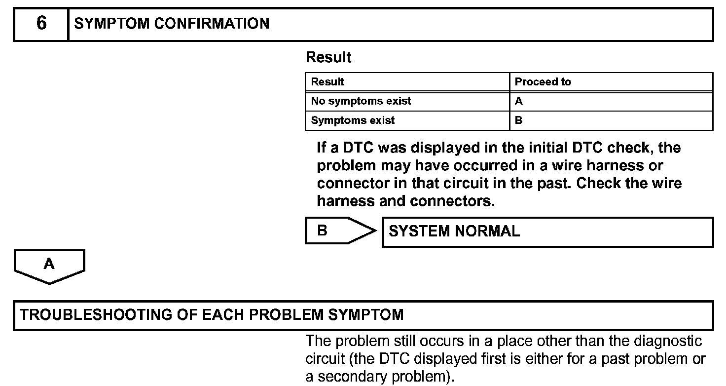 - In the DTC check, it is very important to determine whether the problem indicated by the DTC either: 1) still occurs, or 2) occurred in the past but has returned to normal. In addition, the DTC should be compared to the problem symptom to see if they are related. For this reason, DTCs should be checked before and after confirmation of symptoms (i.e., whether or not problem symptoms exist) to determine current system conditions, as shown in the flowchart.