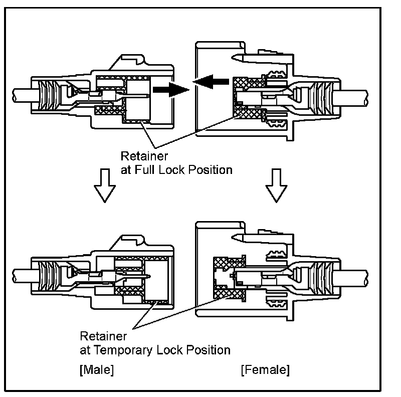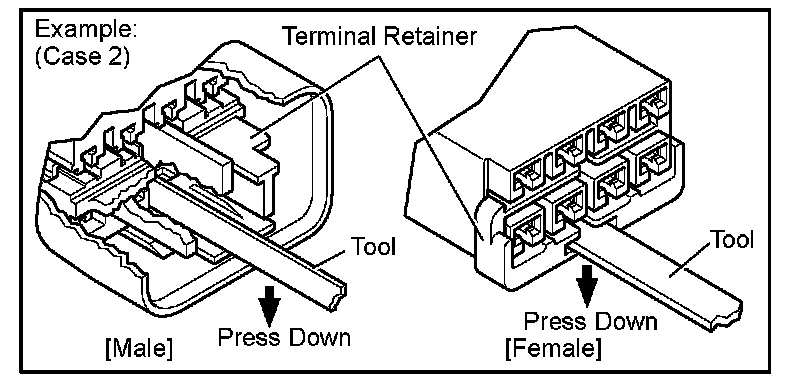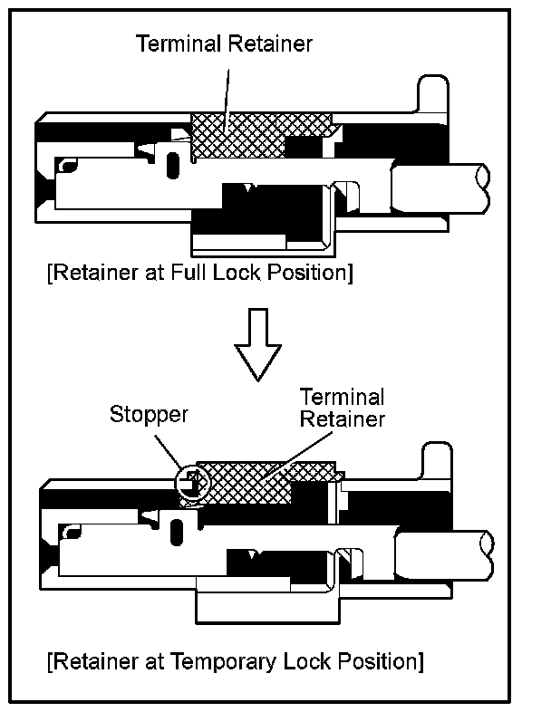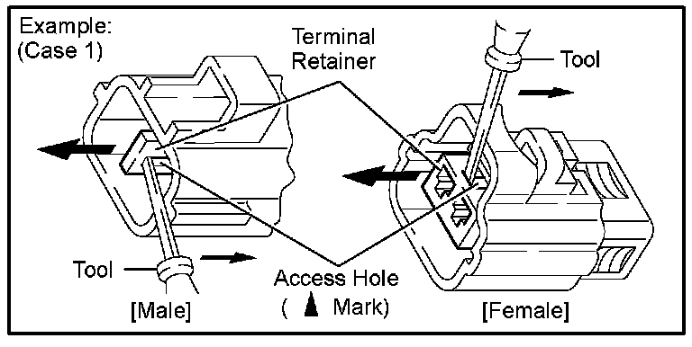 Insert the special tool into the terminal retainer access hole ( Mark) and pull the terminal retainer up to the temporary lock position.