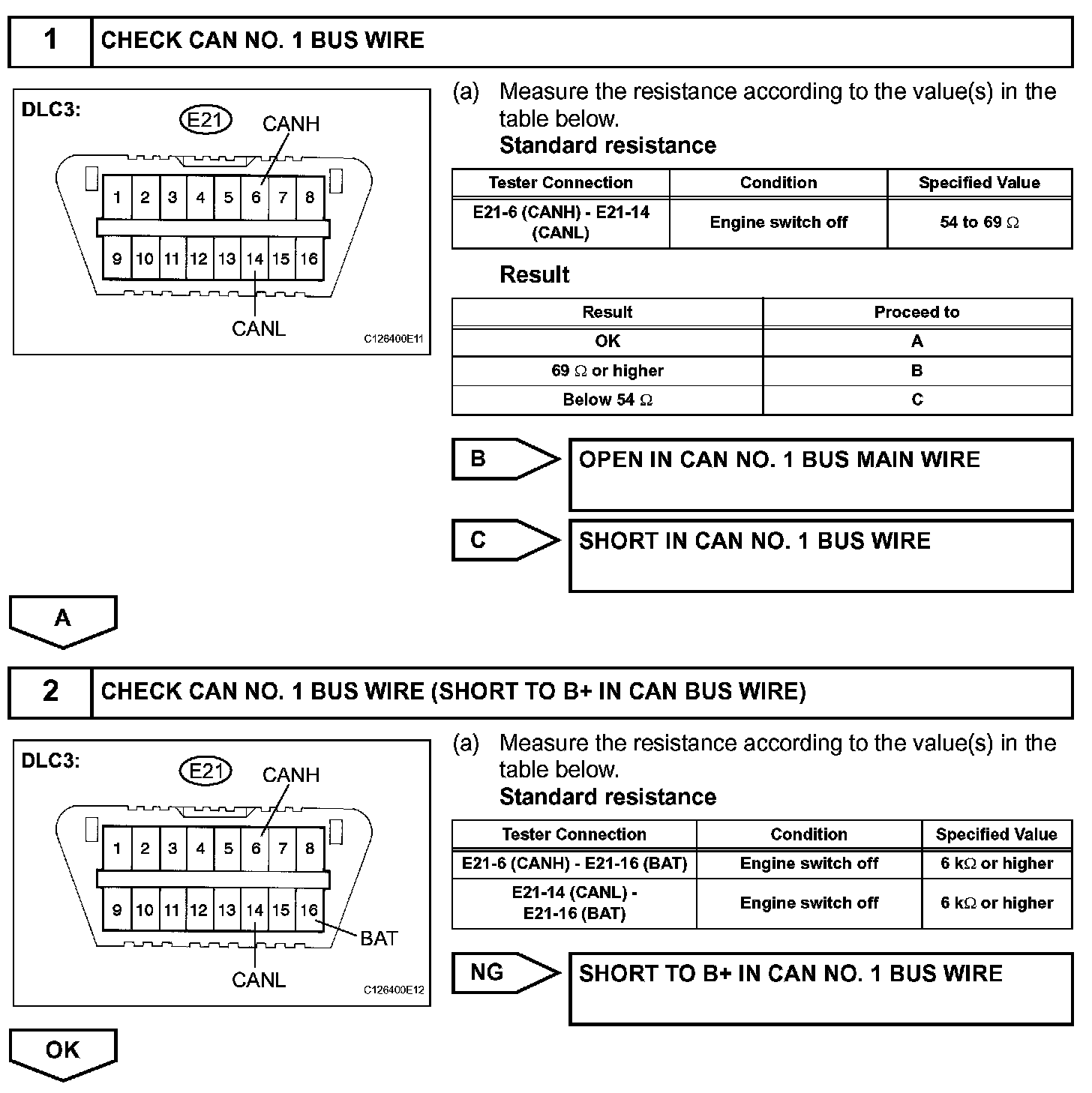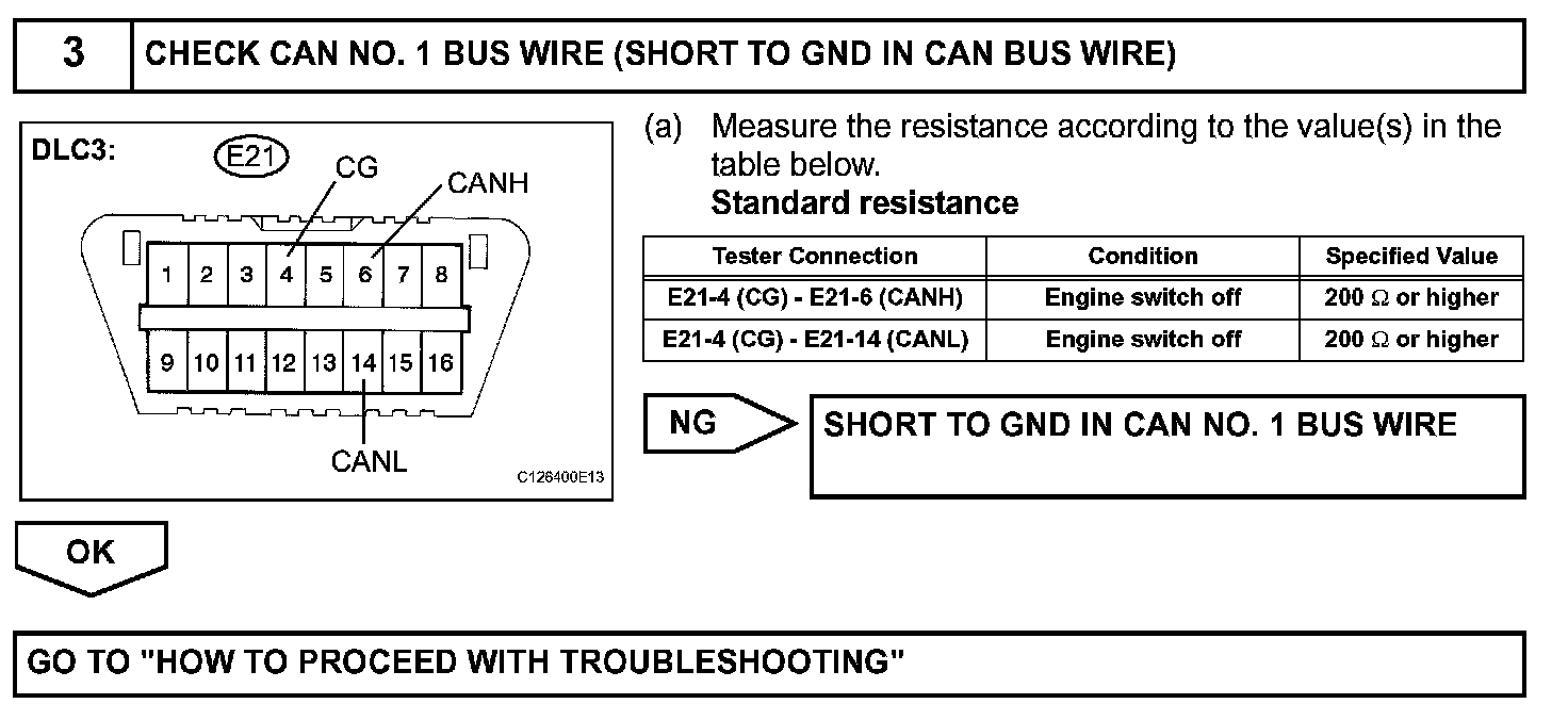 When all DTCs and sensors connected to the CAN communication system are not displayed on the intelligent tester's "BUS CHECK" screen via CAN VIM, first measure the resistance between the terminals of the DLC3 to specify the trouble area.