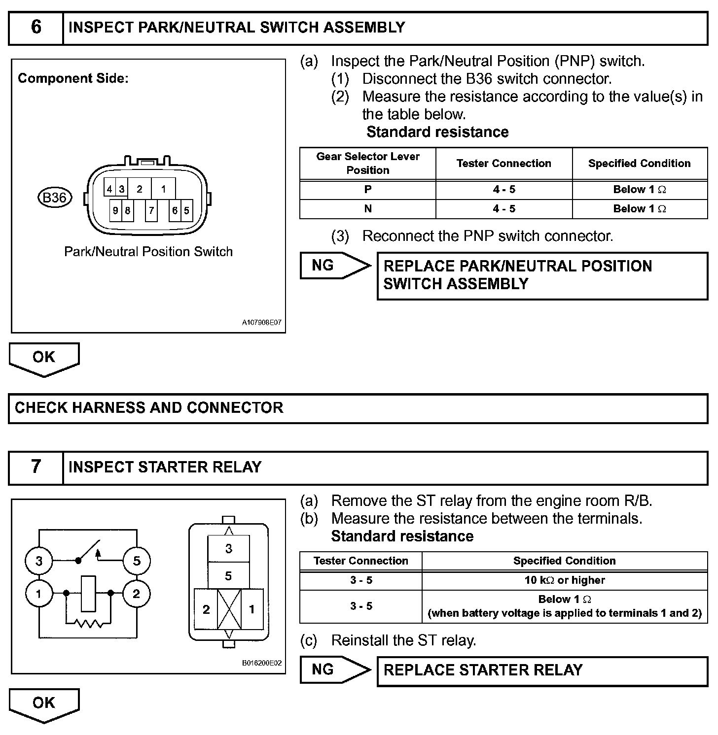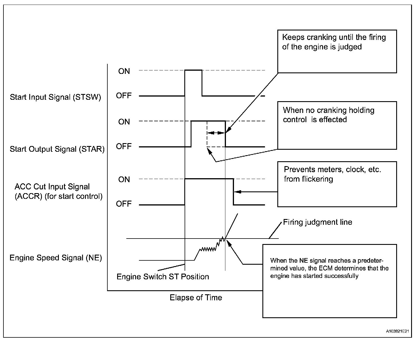 The cranking holding control system provides current to the starter when the ECM detects the engine switch's start signal (STSW). When the ECM performs a firing judgment, the system cuts current to the starter. When the ECM receives the STSW signal, it turns on the ST CUT relay, which prevents flickering of the combination meter, clock, audio system, etc. Also, the ECM sends a signal to the ECM's STAR terminal. Then the STAR output signal travels through the park/neutral position (PNP) switch to the STARTER relay, causing the starter to be activated.