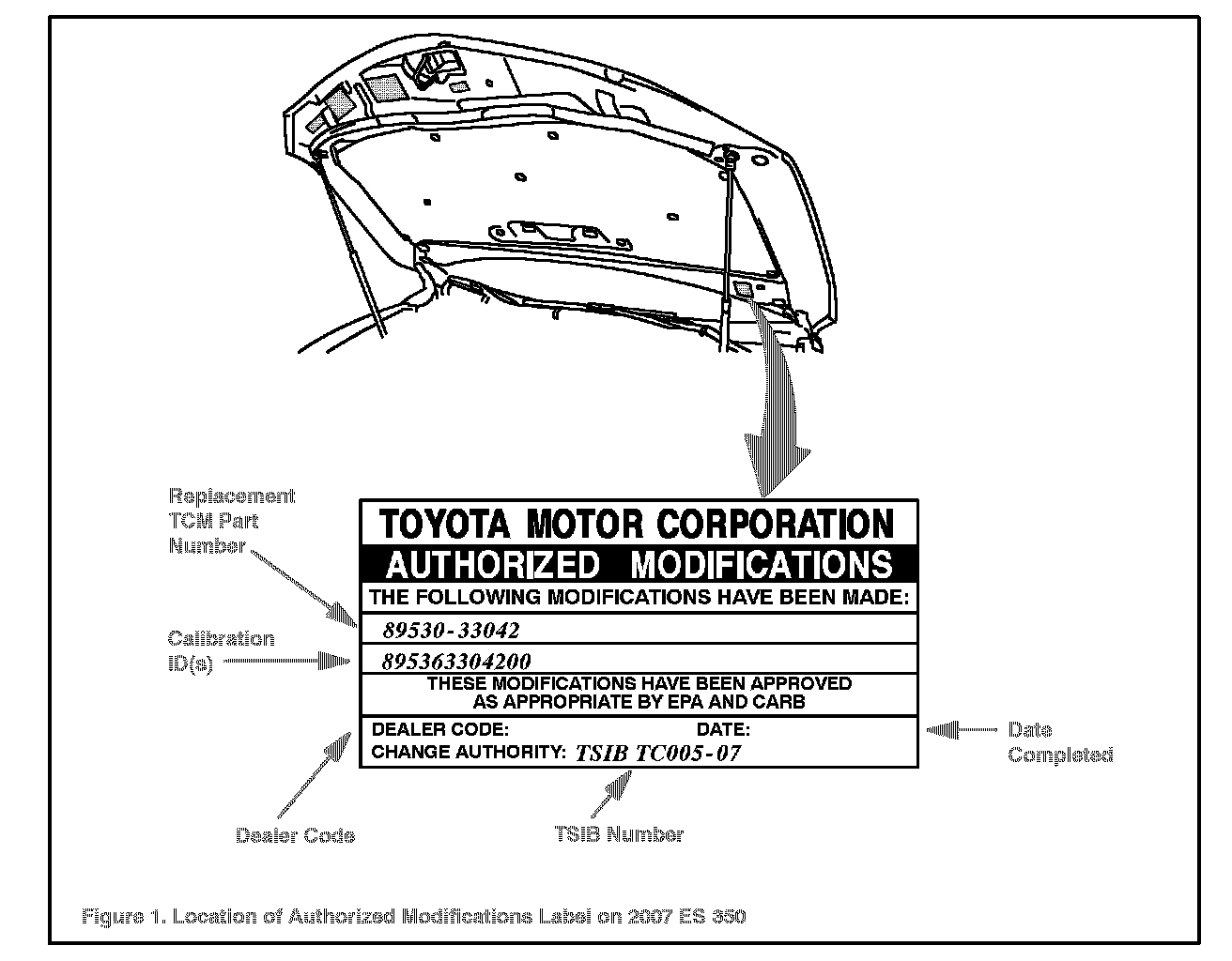 1. Check for the Authorized Modifications Label affixed to the vehicle in the location shown in Figure 1. Confirm if the TCM calibration has been updated. If the calibration ID listed is NOT the latest TCM calibration go to step 2.