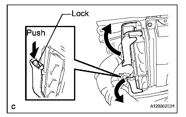 1. Raise the 2 levers while pushing the locks on the 2 levers, and disconnect the 2 ECM connectors.