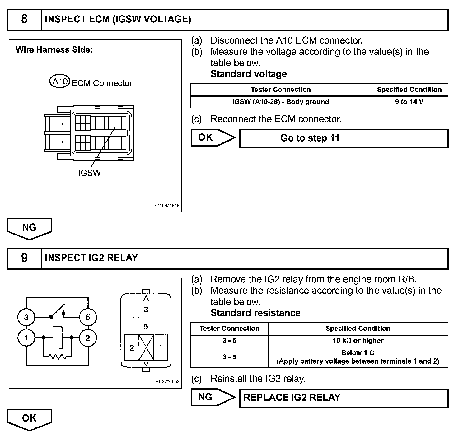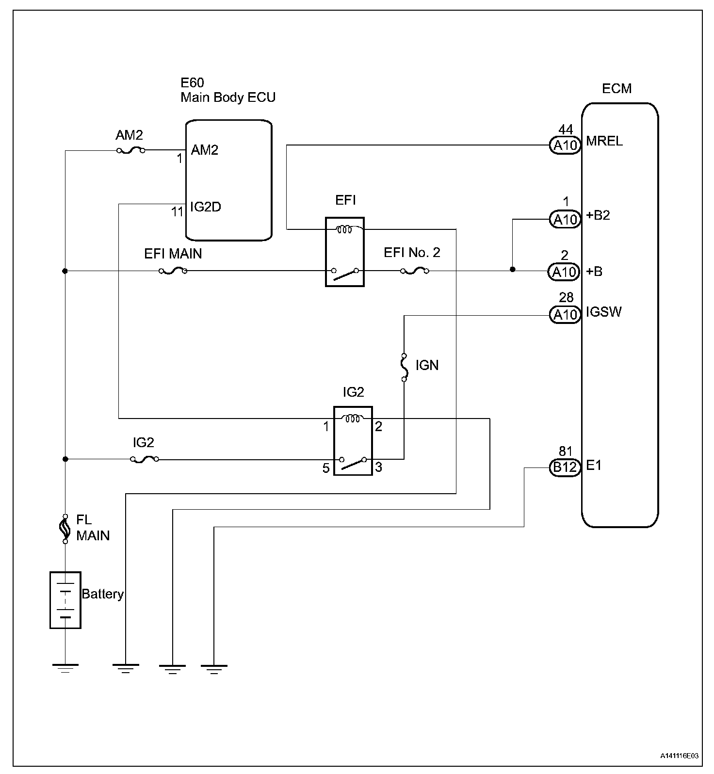 When the engine switch is turned on (IG), the battery voltage is applied to terminal IGSW of the ECM. The ECM MREL output signal causes a current to flow to the coil, closing the contacts of the EFI MAIN relay and supplying power to terminal +B of the ECM.
