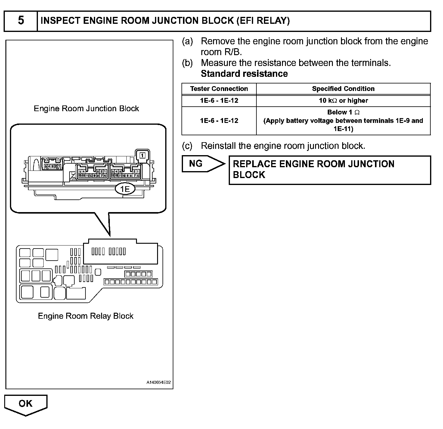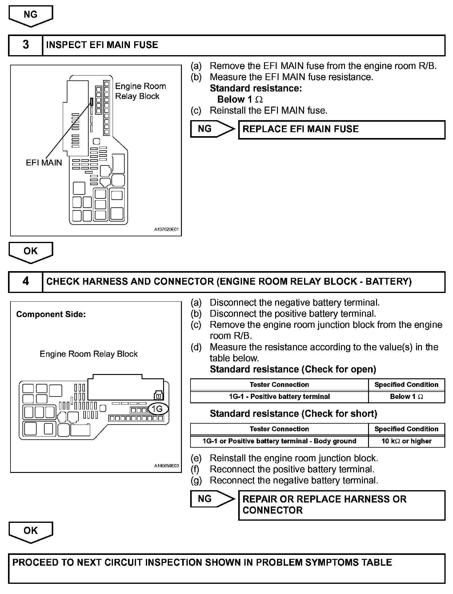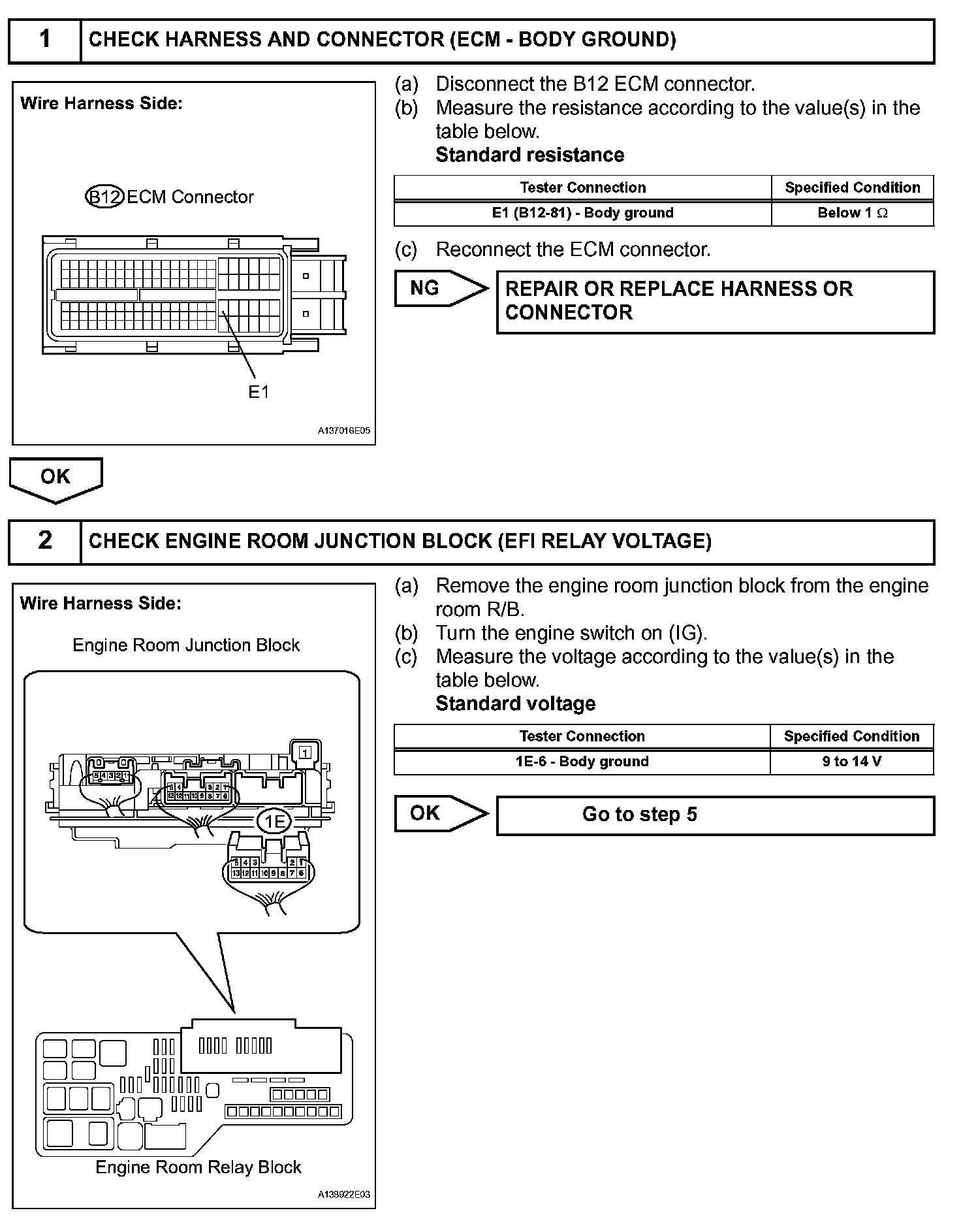 When the engine switch is turned on (IG), voltage from the ECM's MREL terminal applies to the engine room junction block (EFI relay). This causes the contacts of the engine room junction block (EFI relay) to close, which supplies power to terminal +B or +B1 of the ECM.