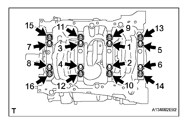 Install and uniformly tighten the 16 main bearing cap bolts in the sequence shown in the illustration.