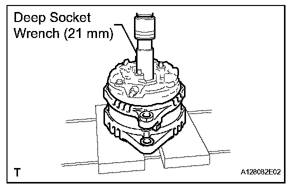 a. Using a deep socket wrench (21 mm) and a press, slowly press in the generator coil assembly.
