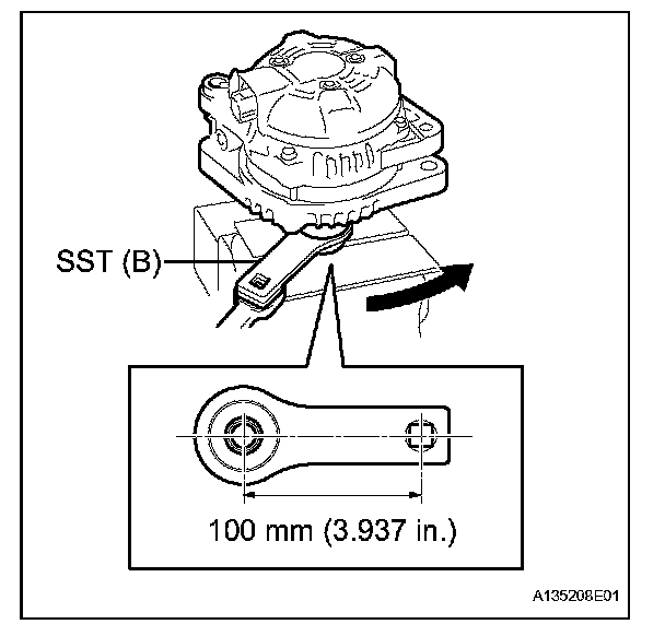 f. Tighten the pulley by turning SST (B) in the direction given in the illustration.