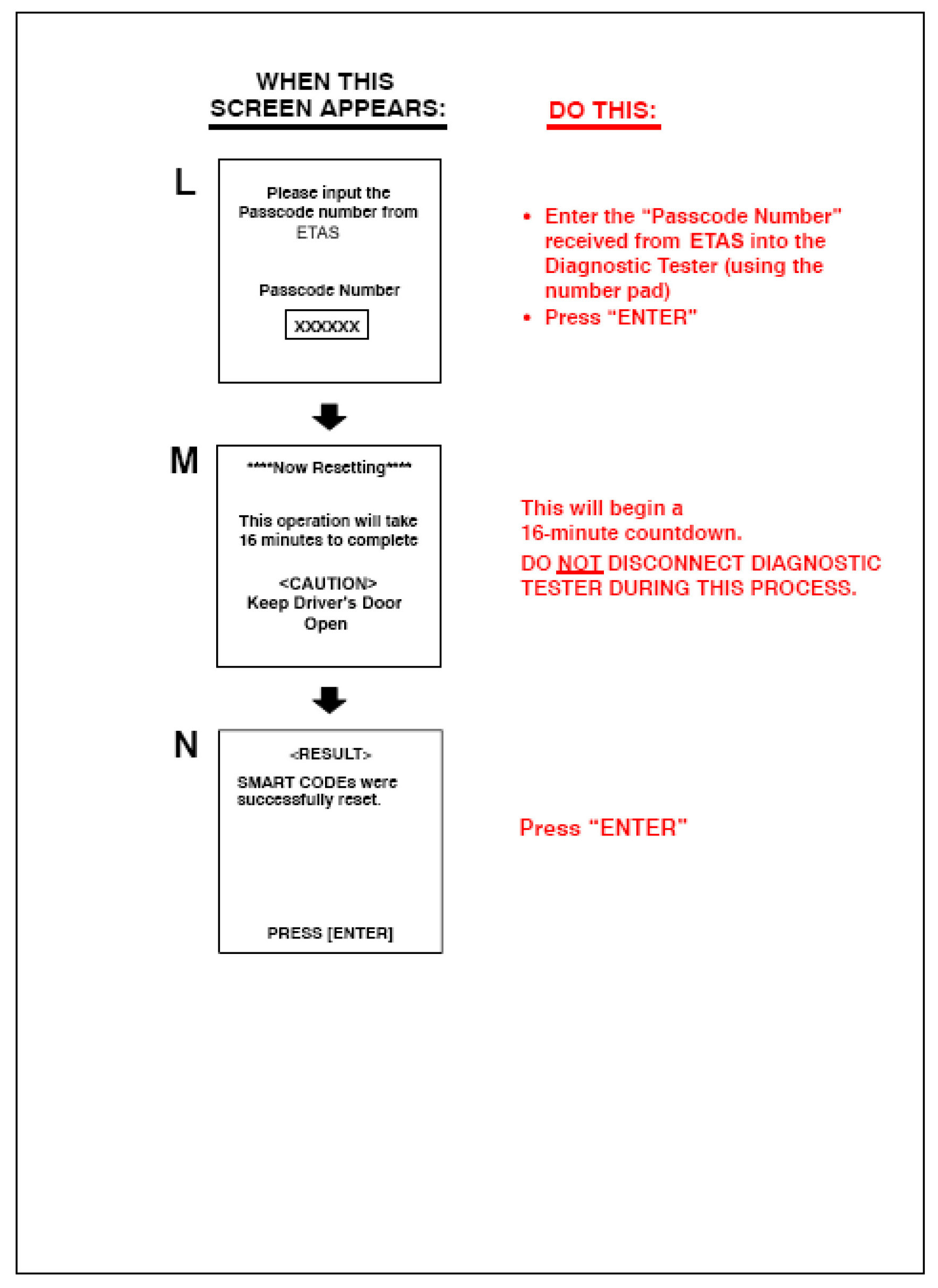 Follow the Diagnostic Tester screen flows. This procedure works best if you use the instructions under the "DO THIS" column and use the screen prints to know WHEN to perform the instructions only.