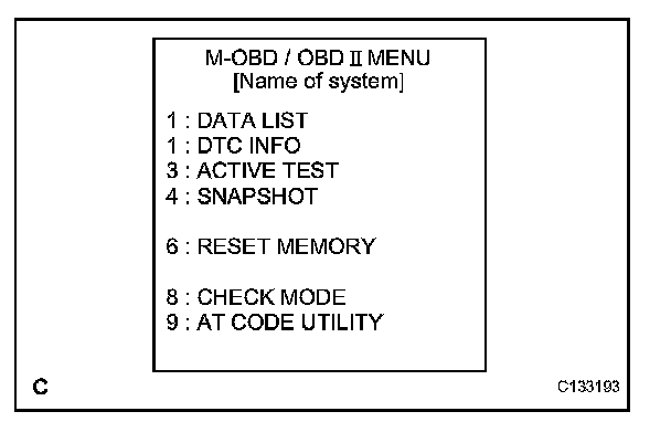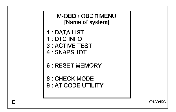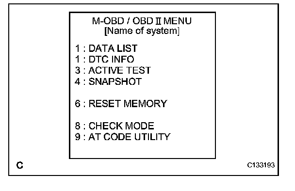 (3) Enter the menu items in this order: DIAGNOSIS / OBD/MOBD / ECT / AT CODE UTILITY.
