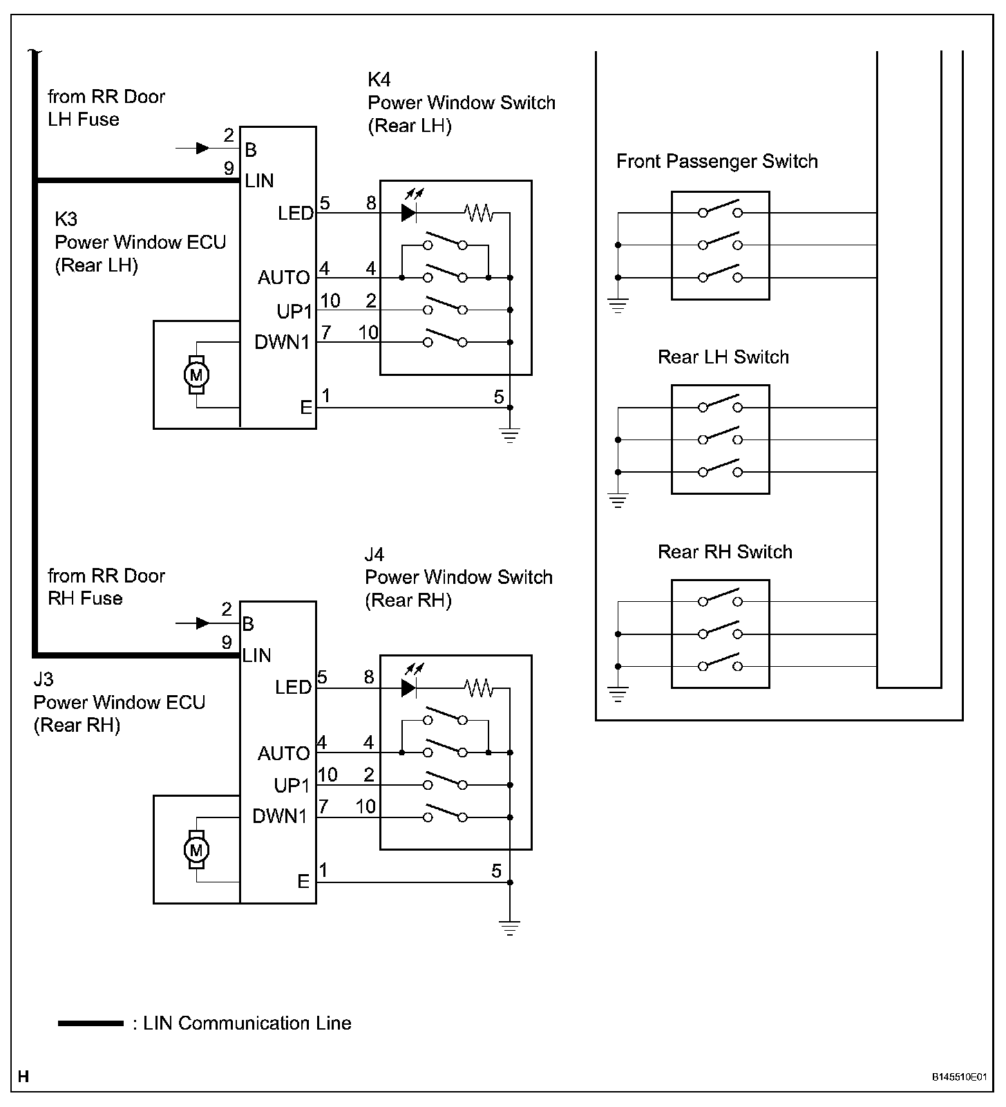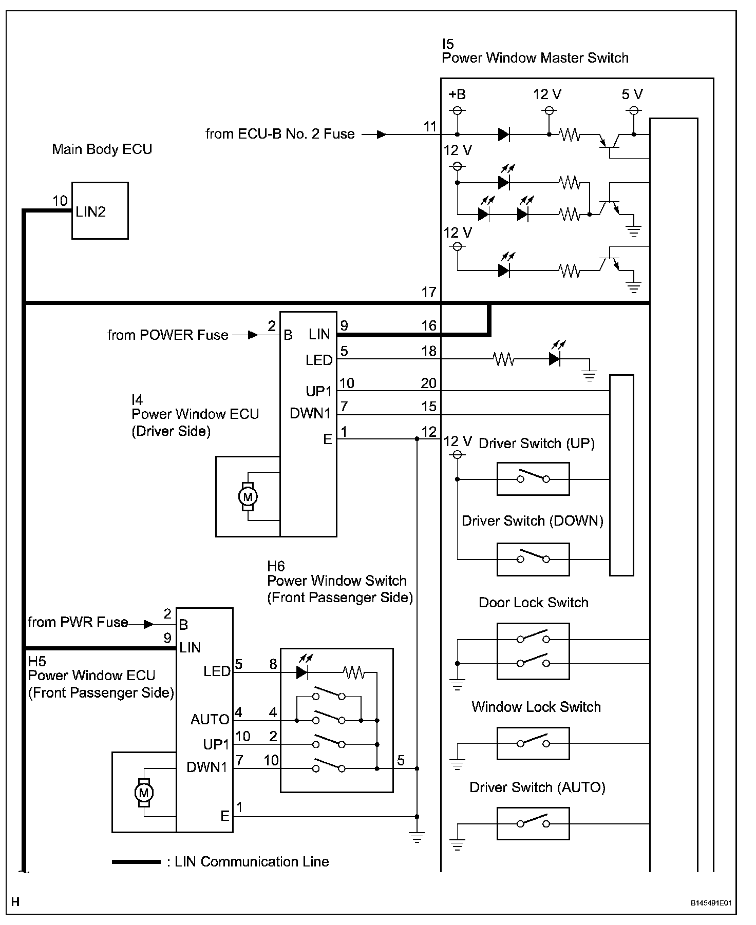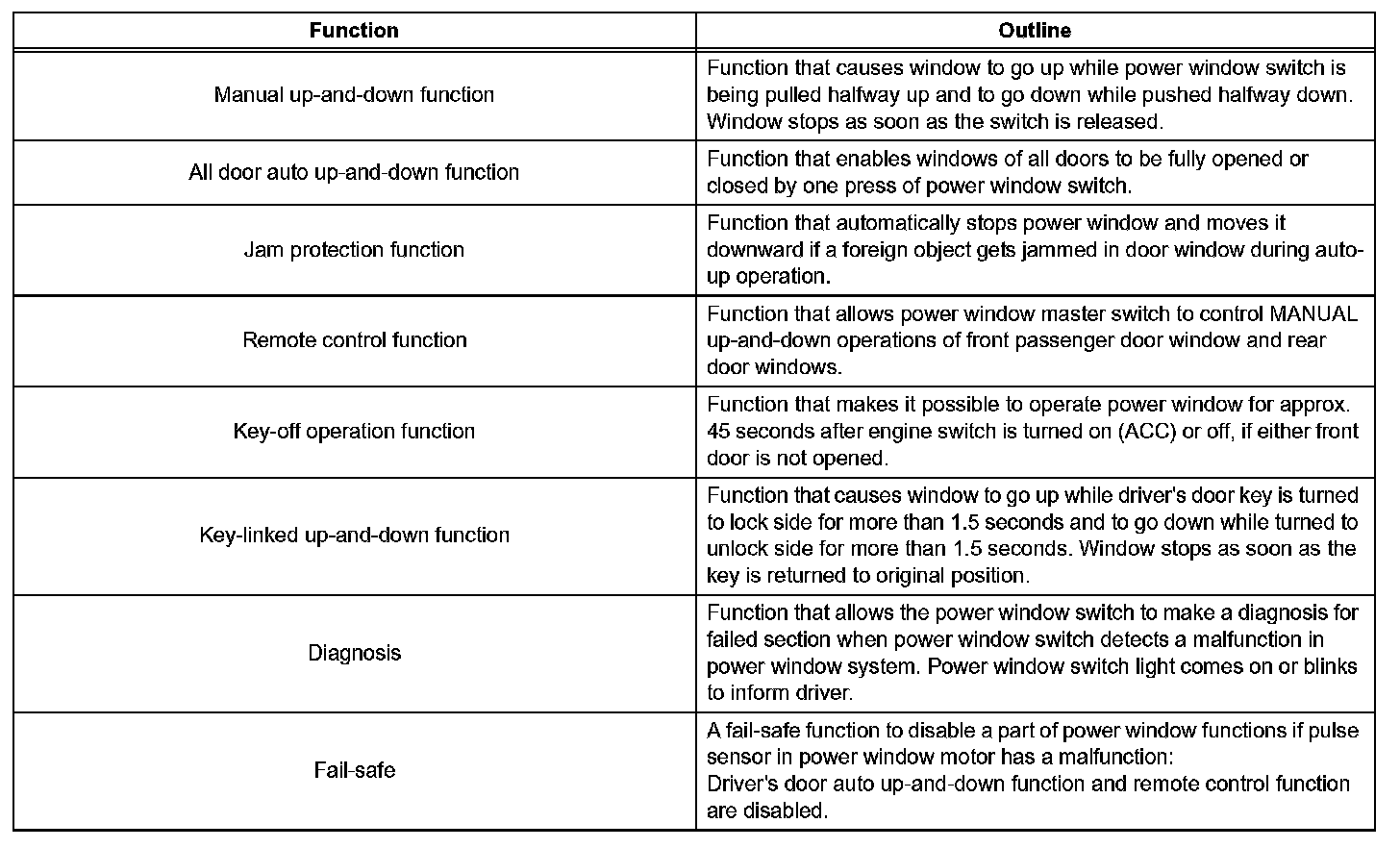 a. The power window control system controls the power window operation using the power window regulator motors. The main controls of this system are the power window regulator master switch, which is mounted on the driver side door, and the power window regulator switches, which are mounted on the passenger side door and rear doors. Operating a window switch results in electrical power being transmitted to the corresponding power window regulator motor.