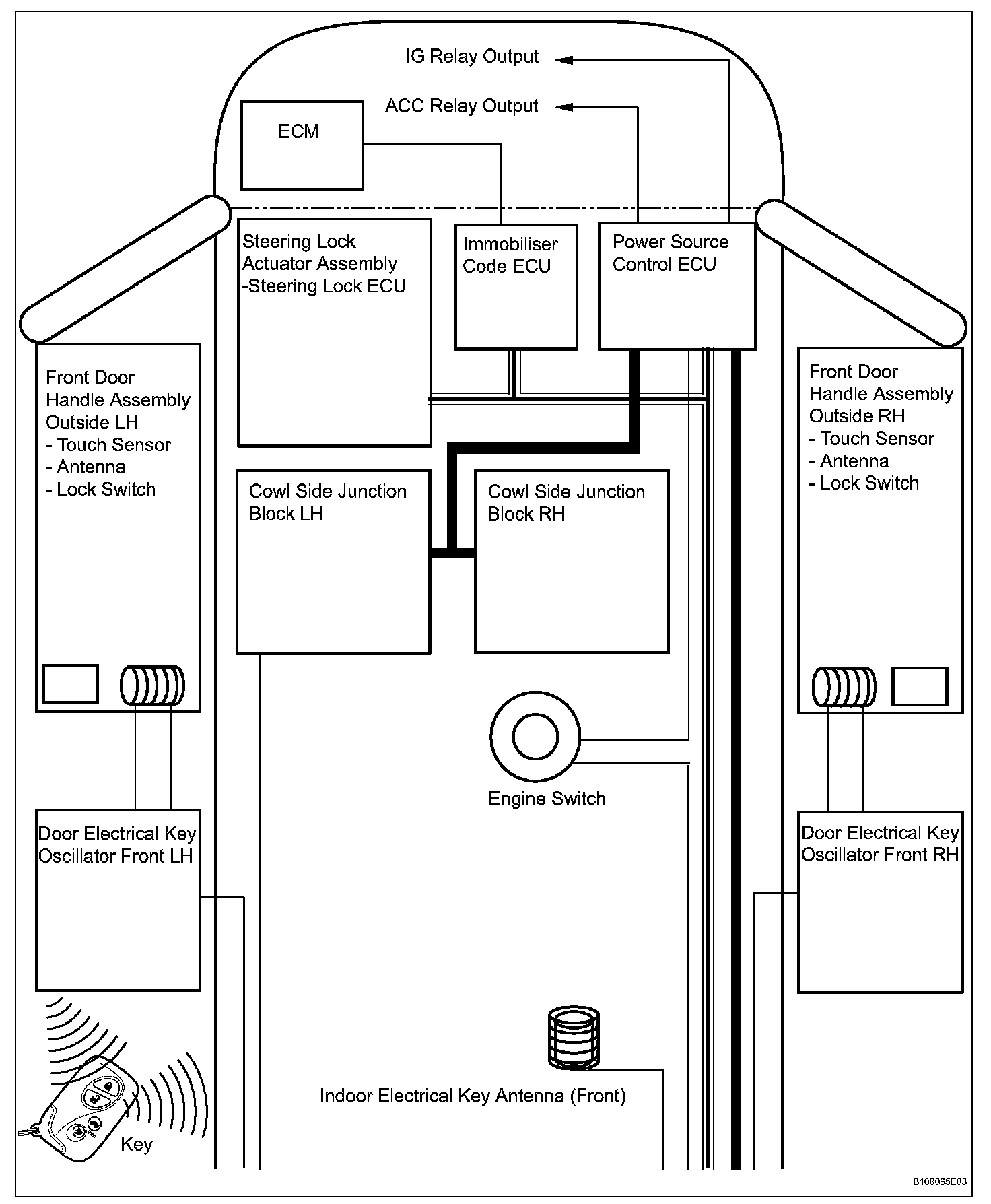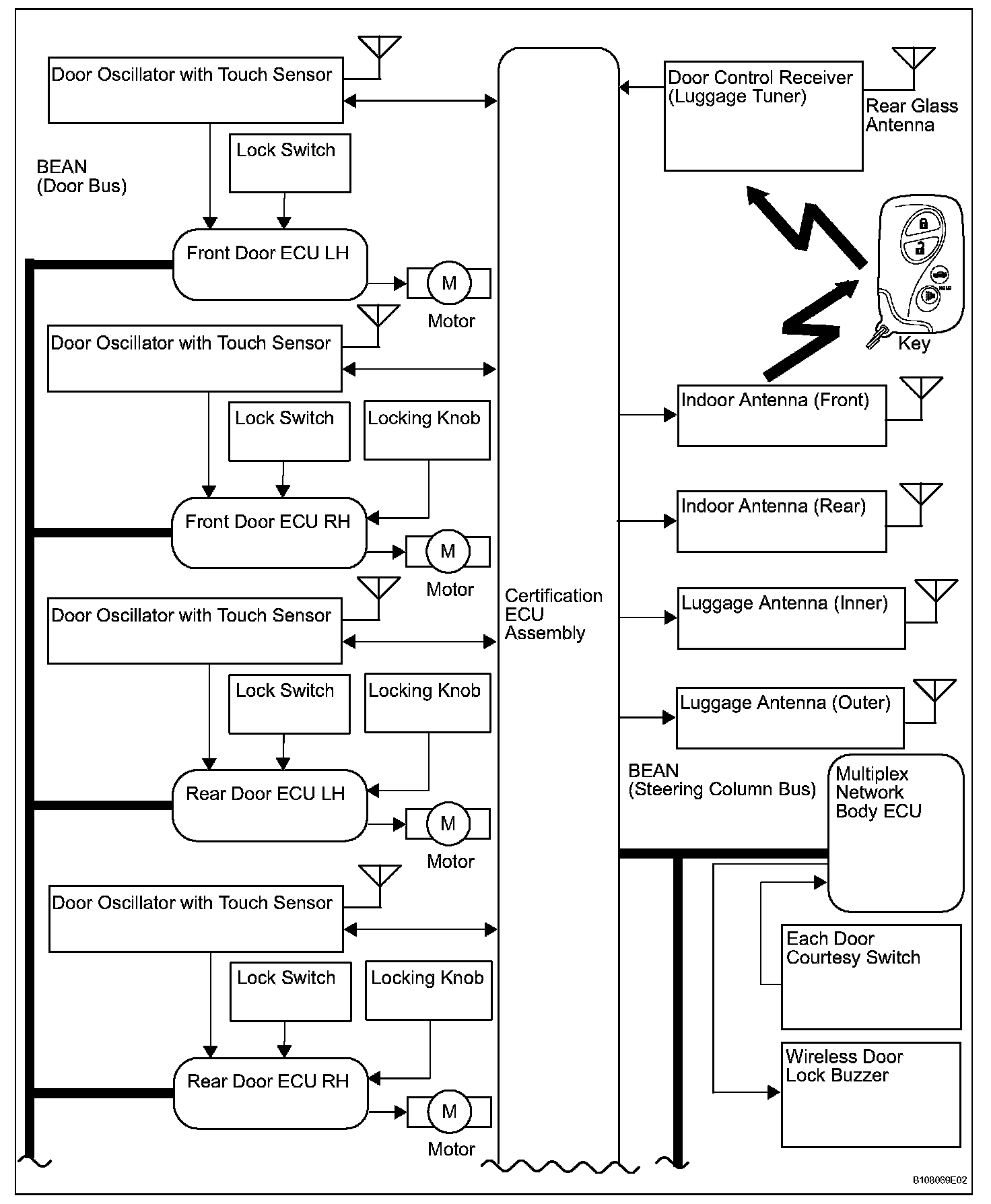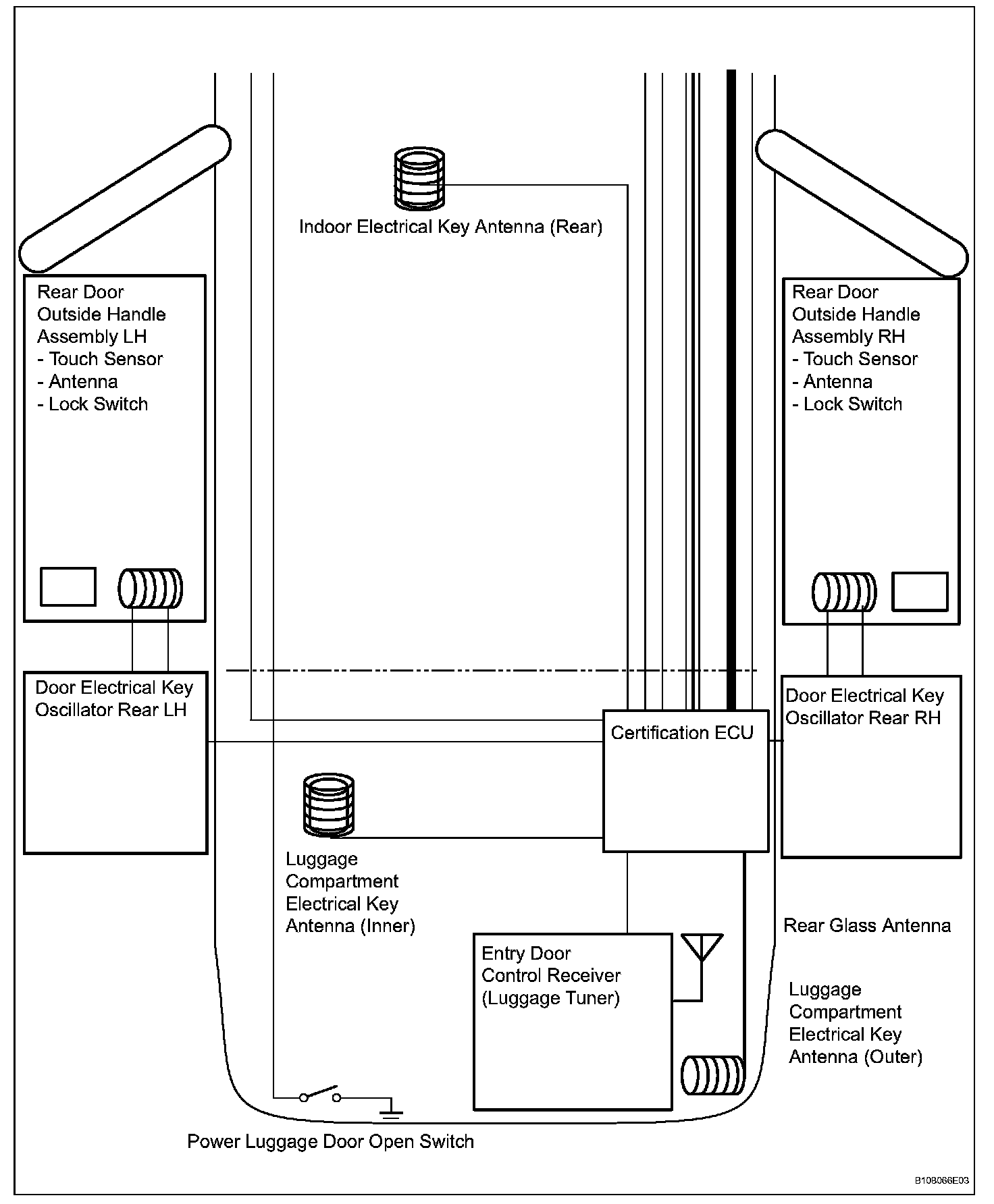 - The detection area of each door oscillator is formed by transmitting a request signal every 0.25 seconds while the engine switch is off and each door is locked. In this way, it detects the proximity of a key. During entry lock, the detection area is formed with the lock switch ON.