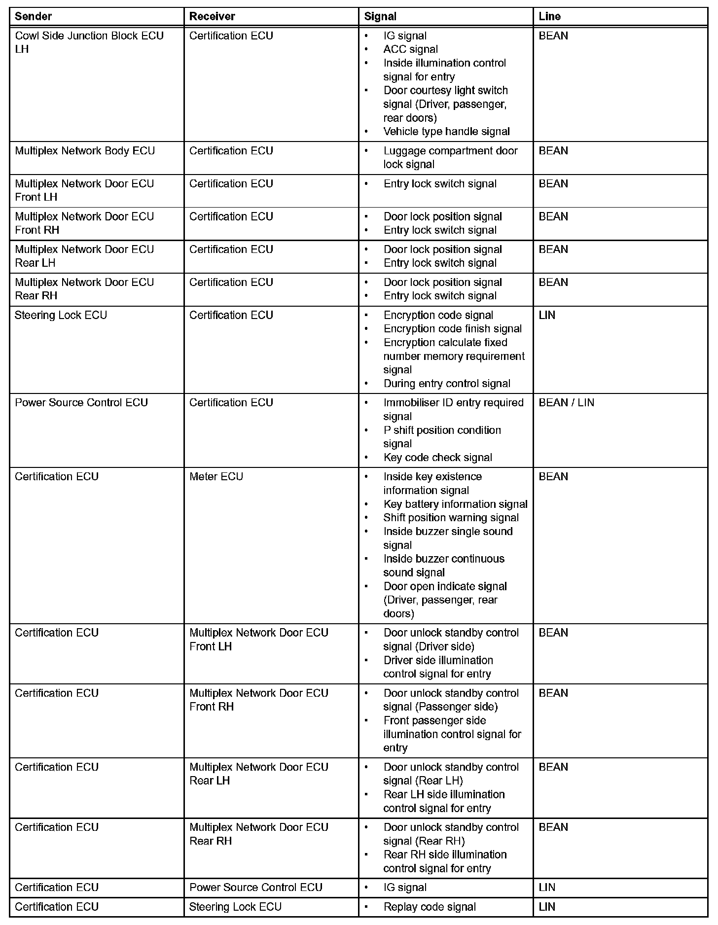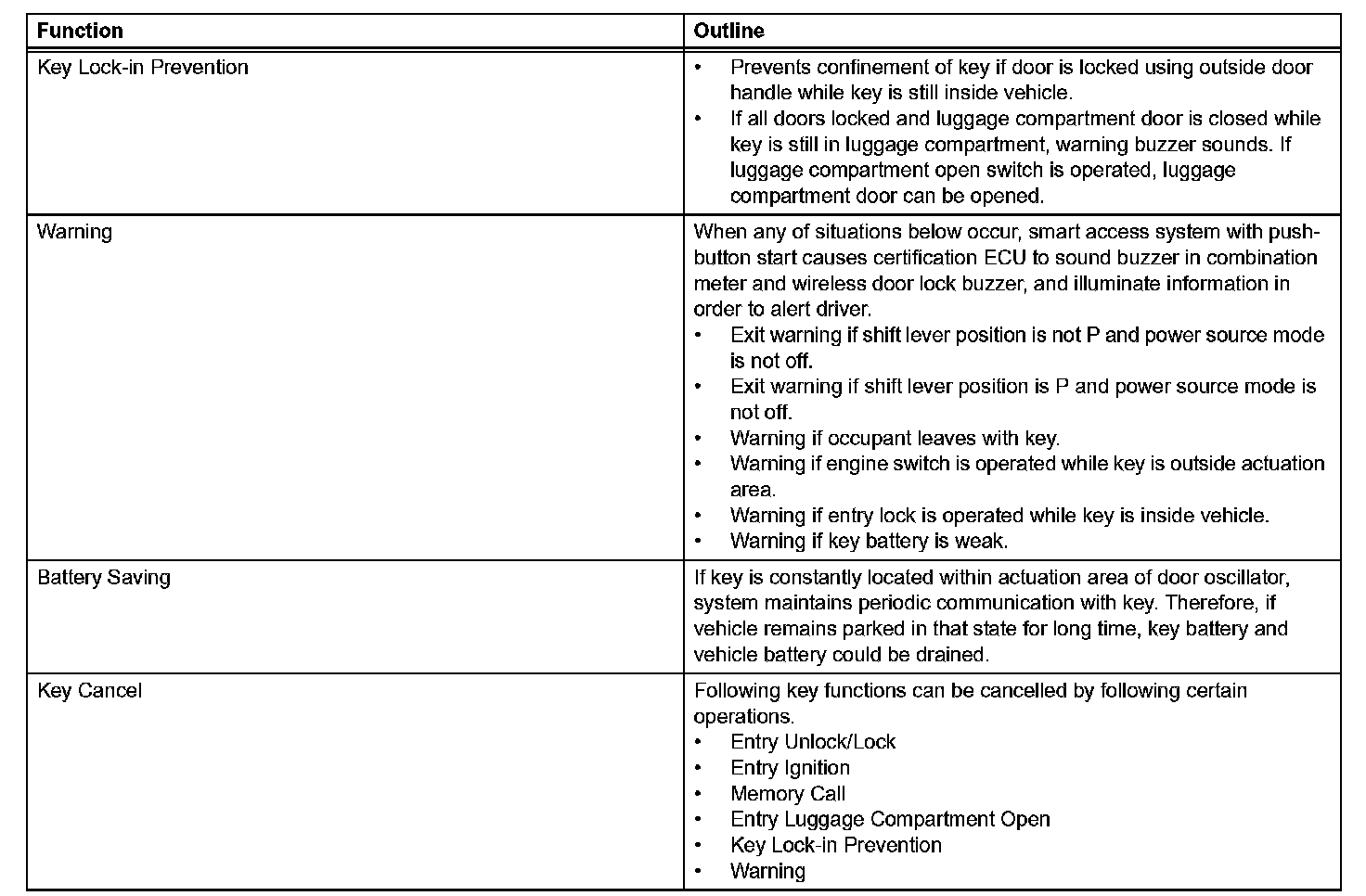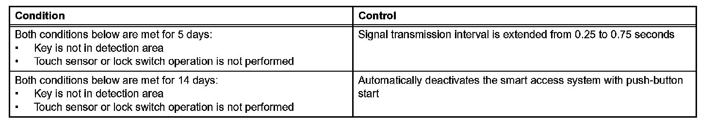 a. Vehicle Battery Saving Function In the smart access system with push-button start, signals are emitted outside of the vehicle at a prescribed interval (0.25 seconds) when the doors are locked. Therefore, the vehicle battery could be drained if the vehicle remains parked for a long time. For this reason, the controls listed are affected.