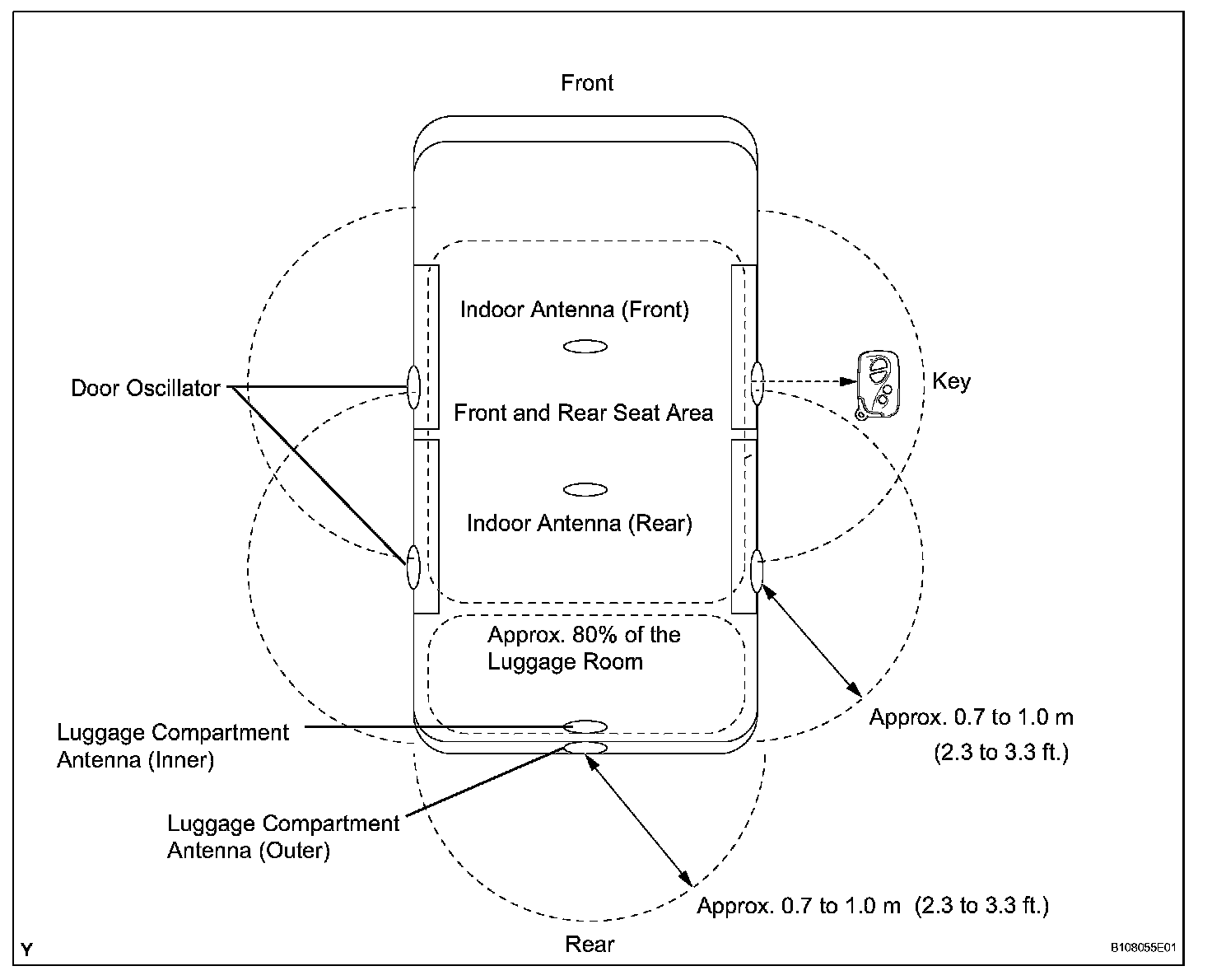 b. Oscillator (each door oscillator, front and rear indoor antenna, luggage compartment inner antenna, luggage compartment outer antenna) Each oscillator transmits the request signal received from the certification ECU, and forms a key detection area to detect the presence of a key. The detection area formed by each door oscillator and luggage compartment outer antenna is approximately 0.7 to 1.0 m (2.3 to 3.3 ft.) from the outside handle of each door or the center of the rear bumper.