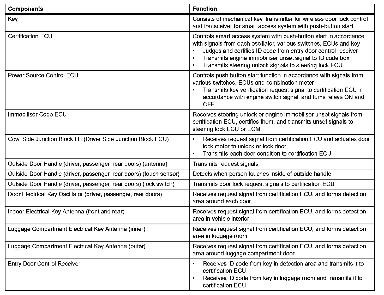 - This system is controlled by the certification ECU. When the certification ECU detects the presence of the smart access system with push-button start in one of the detection areas, it identifies and checks the ID code, and outputs operation signals to the related ECU in accordance with their functions.