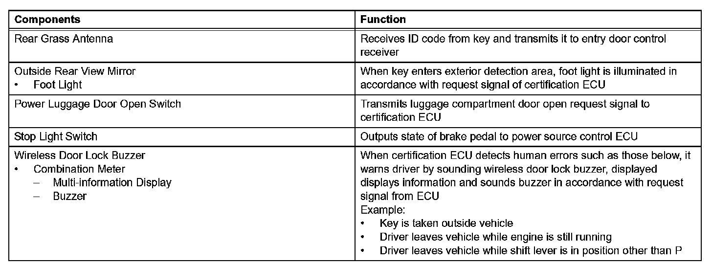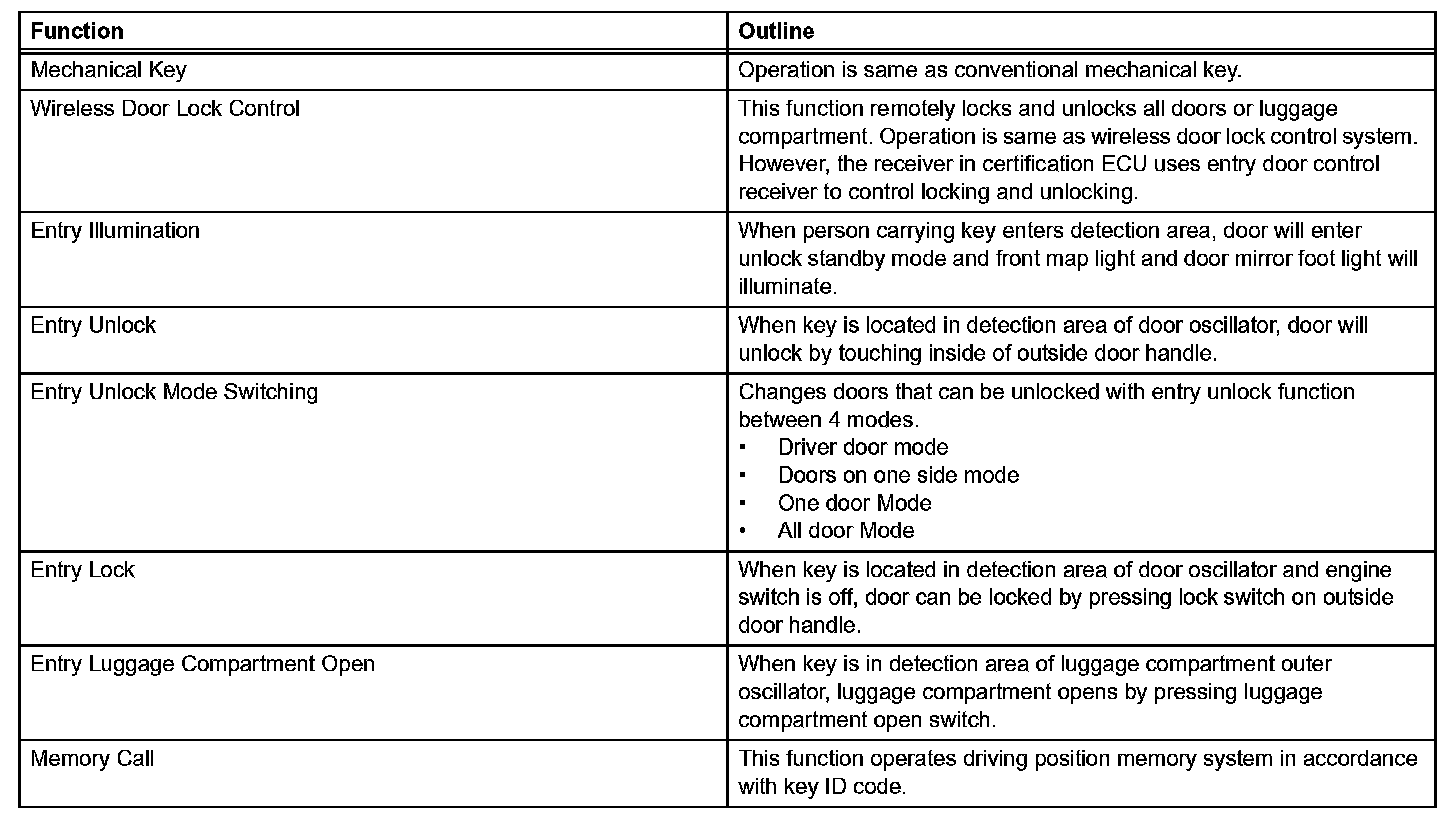 a. In addition to conventional mechanical key and wireless door lock control functions, the entry and start system enables door locking/unlocking, steering lock releasing, engine starting and luggage compartment door opening without operating the key. The only requirement is that the key is in the user's possession.