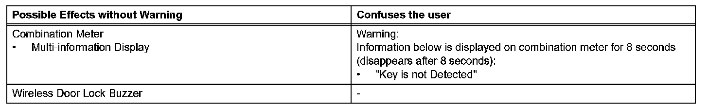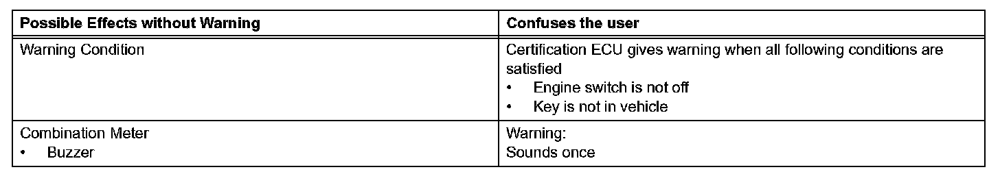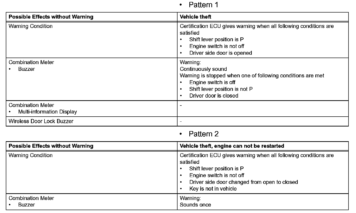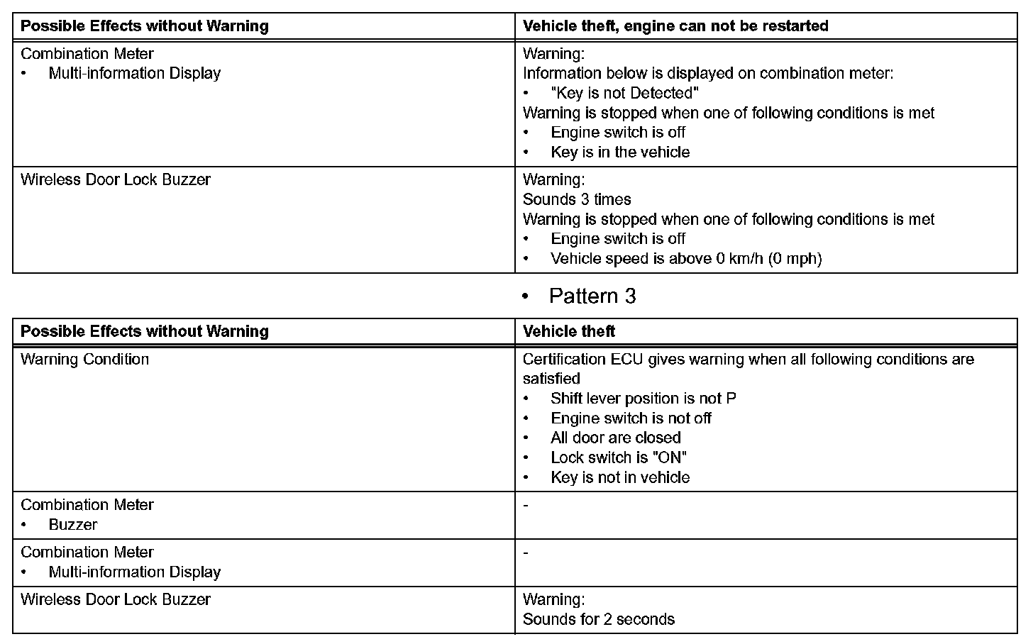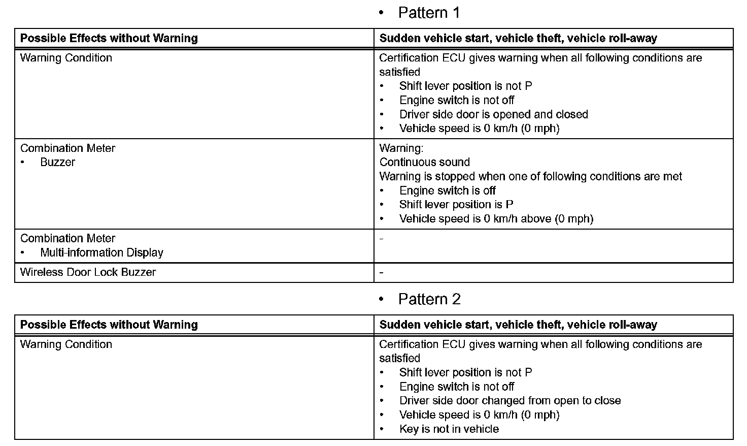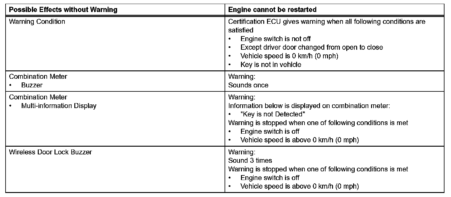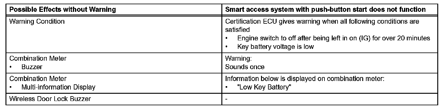 When any of the situations occur, the smart access system with push-button start causes the certification ECU to sound the buzzer in the combination meter and the wireless door lock buzzer, and illuminates the combination meter's multi-information display in order to alert the driver.