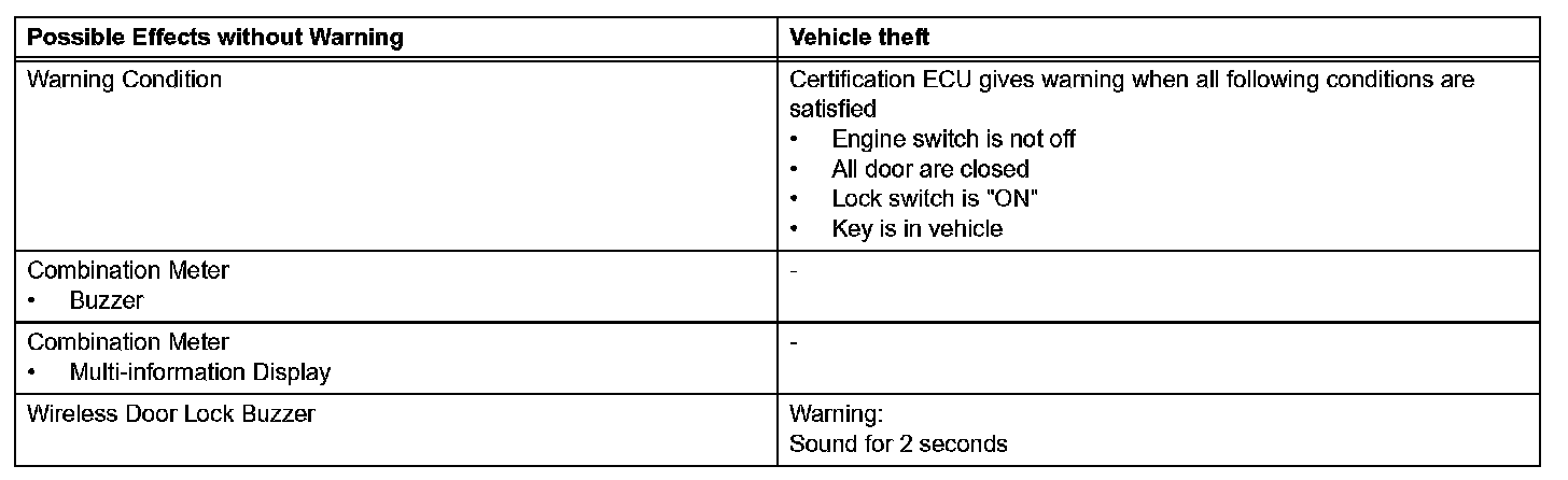 d. If the key is located inside of the cabin, the door lock function will not operate and the alarm buzzer (beep sound) will sound for 2 seconds.