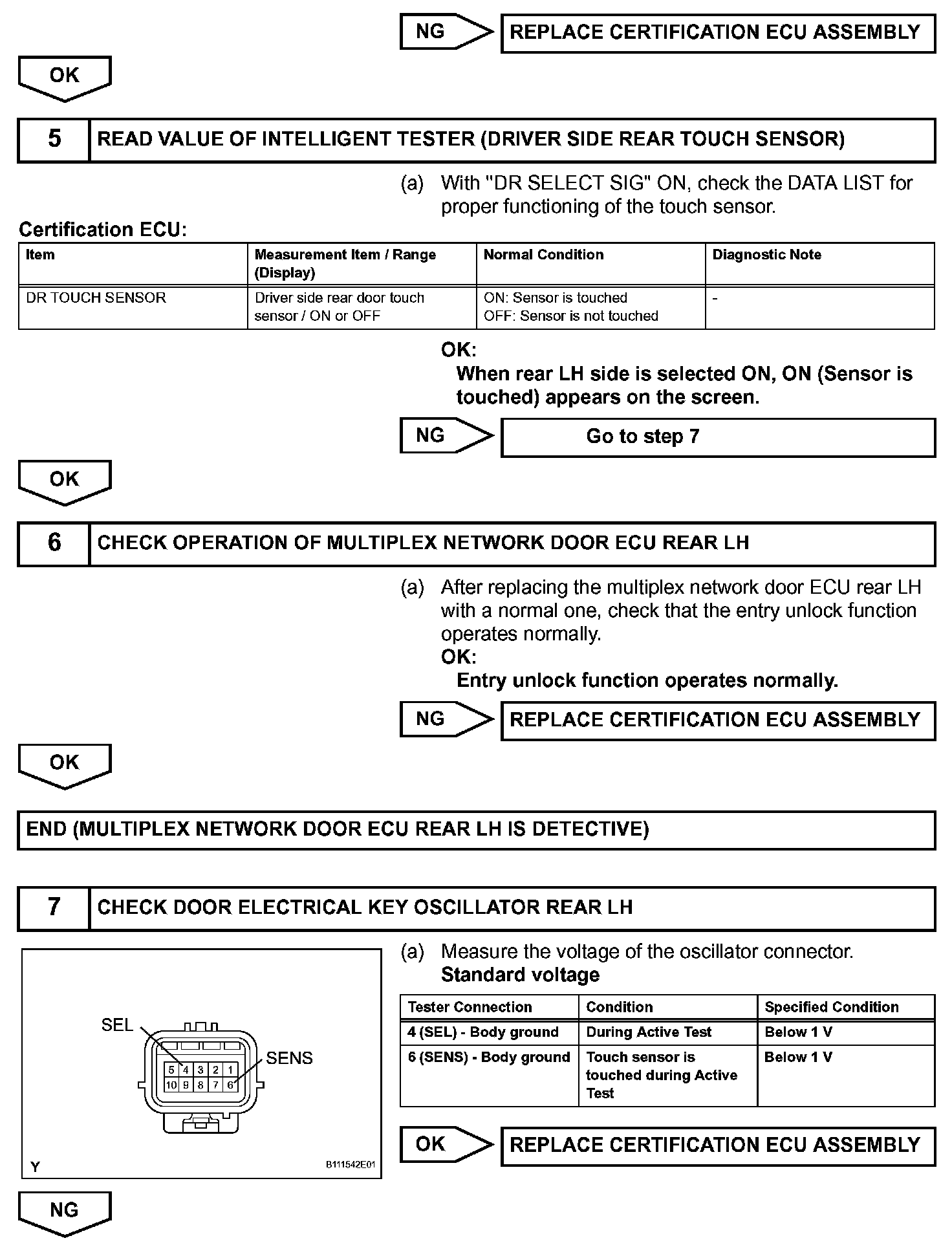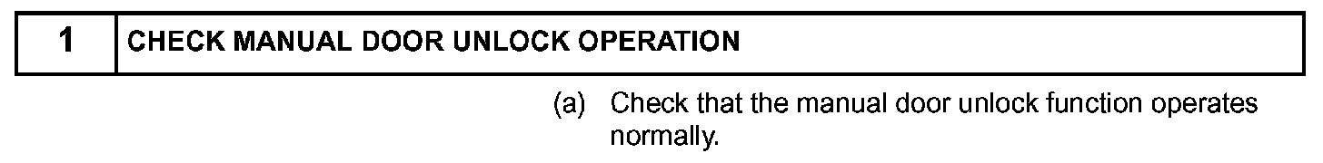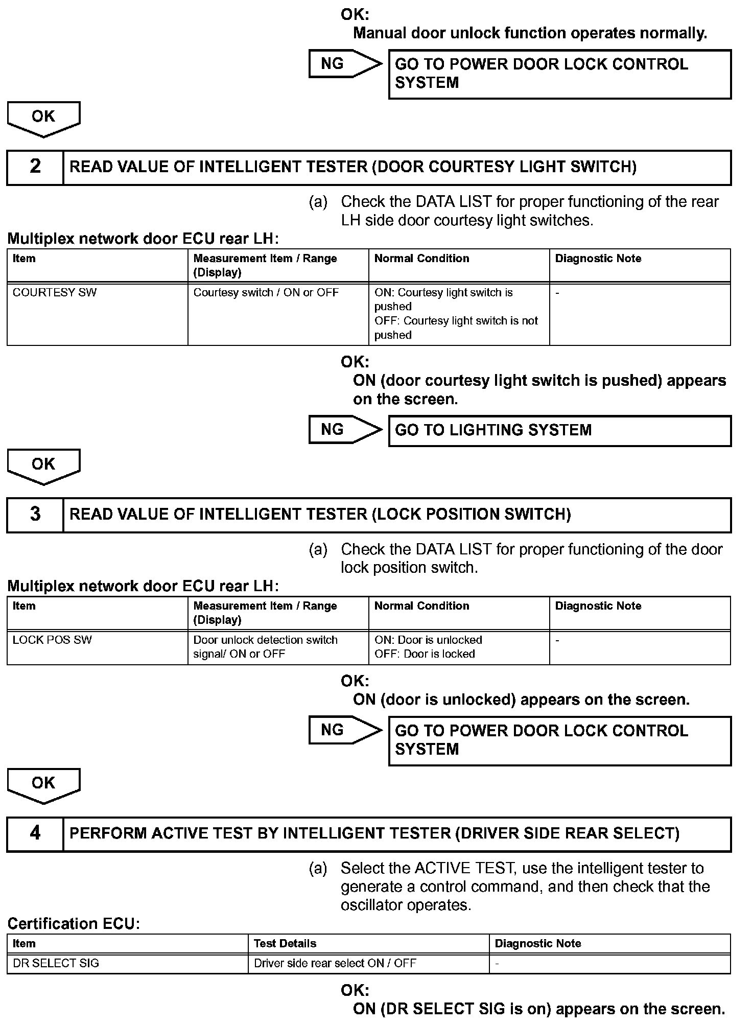 When an ID code from the door electrical key oscillator rear LH matches an ID code from the key, the multiplex network door ECU rear LH (rear door LH ECU) outputs a SEL signal (Lo when output) to the door electrical key oscillator rear LH, activates the touch sensor inside the outside door handle, and enters unlock standby mode. When the touch sensor is touched, the door electrical key oscillator rear LH sends a SENS signal (Lo when output) to the multiplex network door ECU rear LH (rear door LH ECU) and the multiplex network door ECU rear LH (rear door LH ECU) sends an unlock signal to the rear door LH lock.
