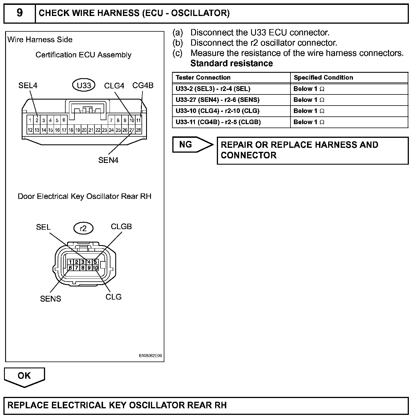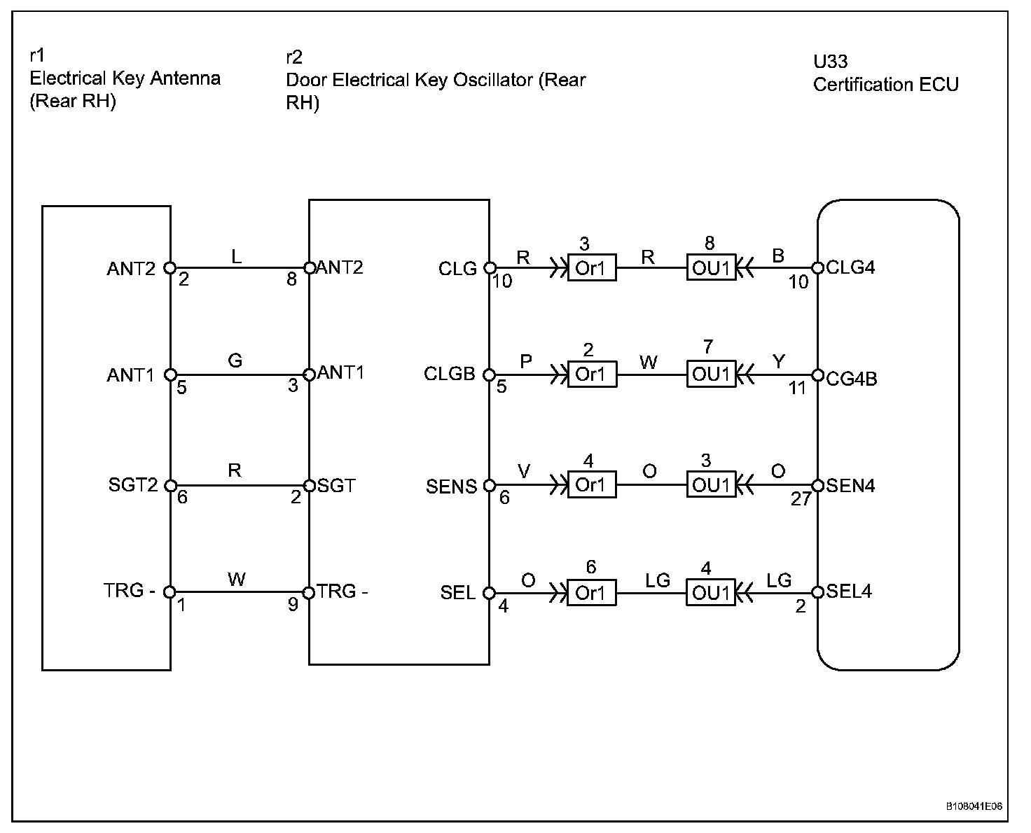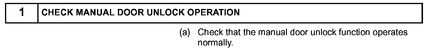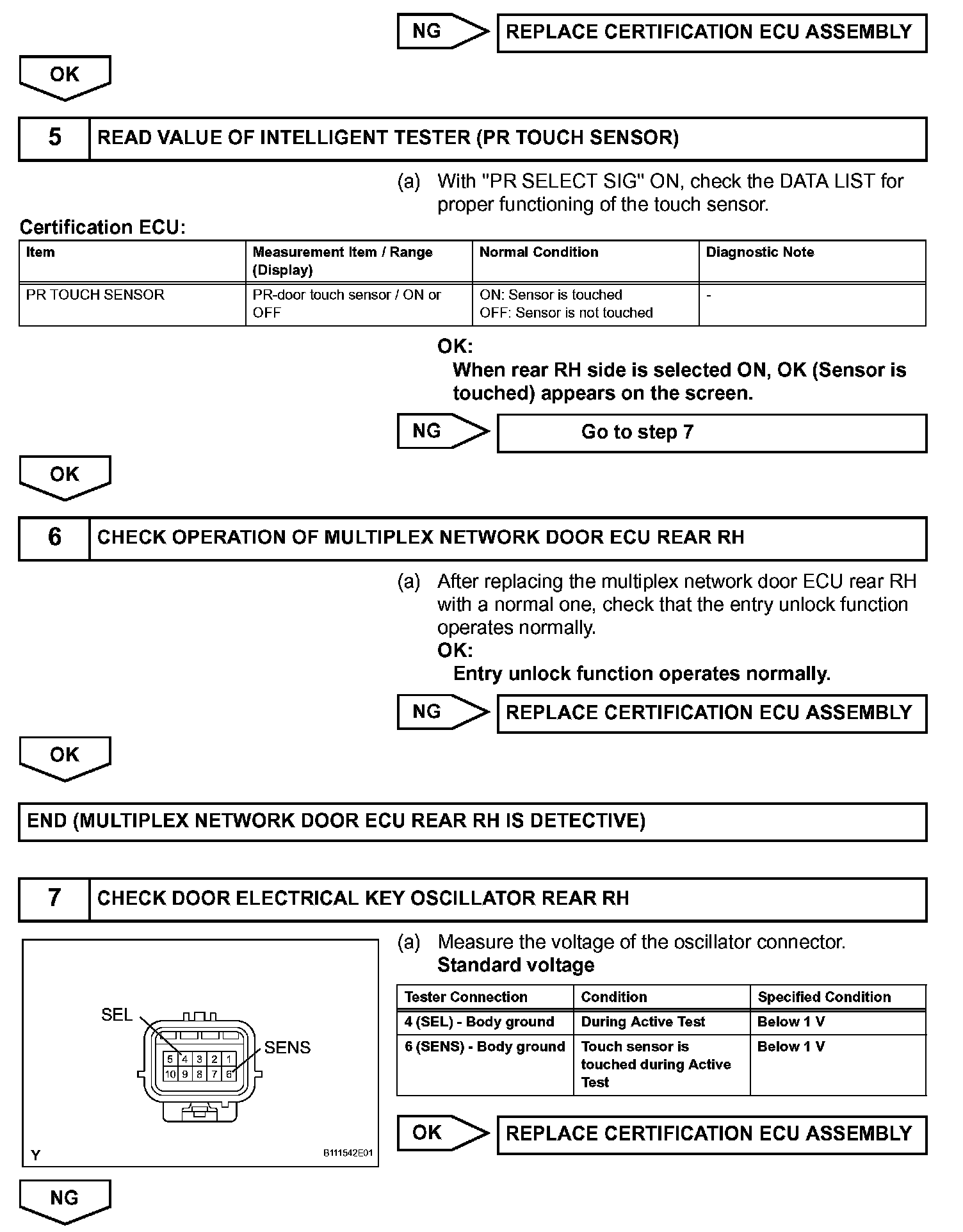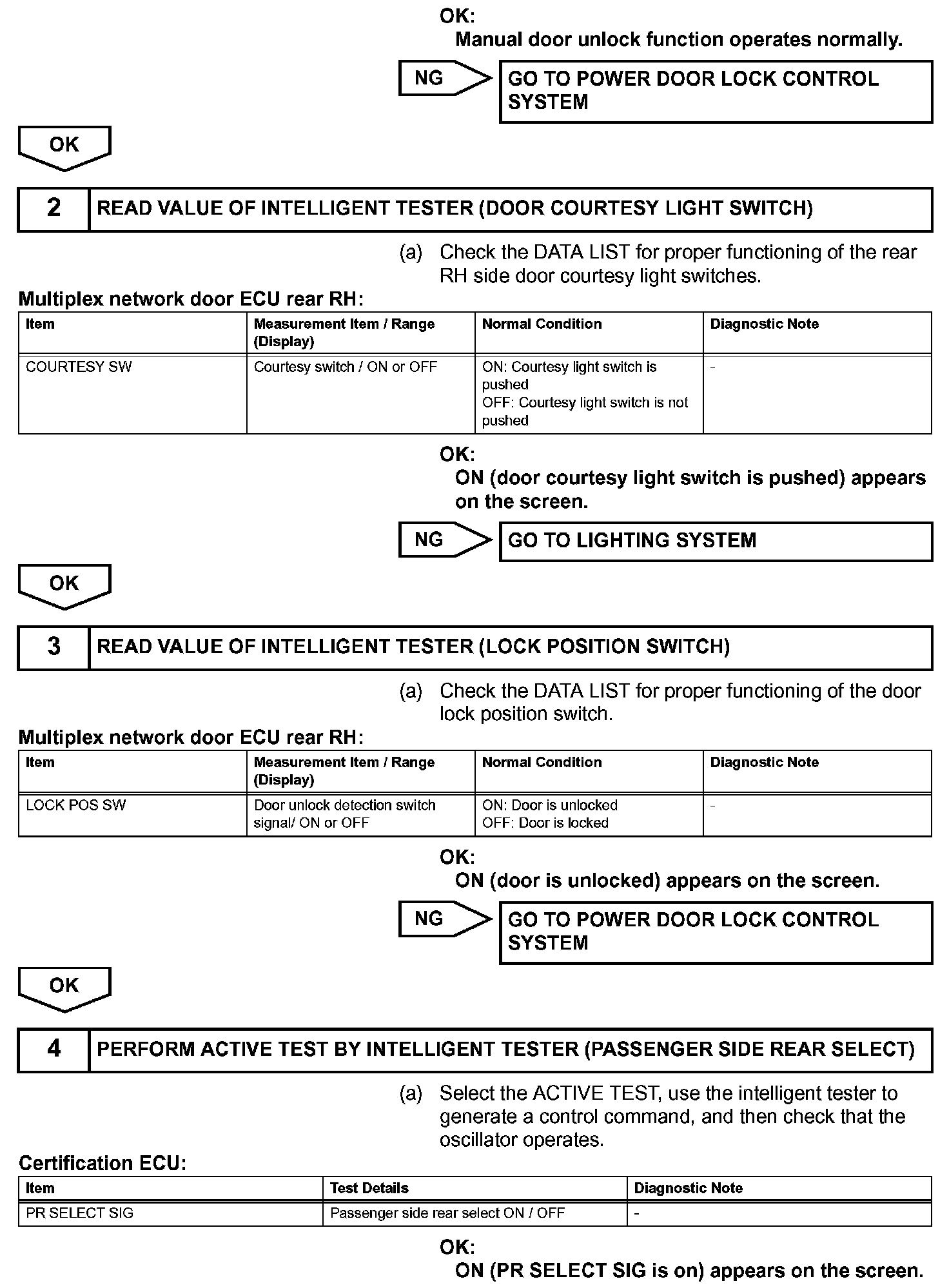 When an ID code from the door electrical key oscillator rear RH matches an ID code from the key, the multiplex network door ECU rear RH (rear door RH ECU) outputs a SEL signal (Lo when output) to the door electrical key oscillator rear RH, activates the touch sensor inside the outside door handle, and enters unlock standby mode. When the touch sensor is touched, the door electrical key oscillator rear RH sends a SENS signal (Lo when output)) to the multiplex network door ECU rear RH (rear door RH ECU) and the multiplex network door ECU rear RH (rear door RH ECU) sends an unlock signal to the rear door RH lock.