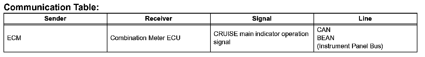 - The ECM illuminates the combination meter's CRUISE main indicator light when it receives the cruise control main switch ON signal.