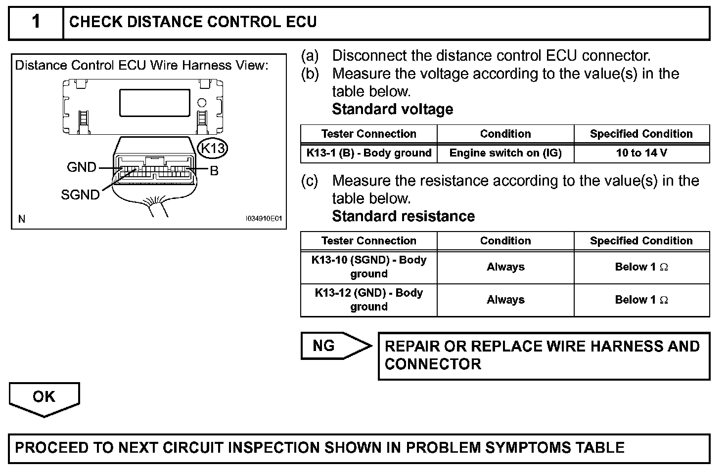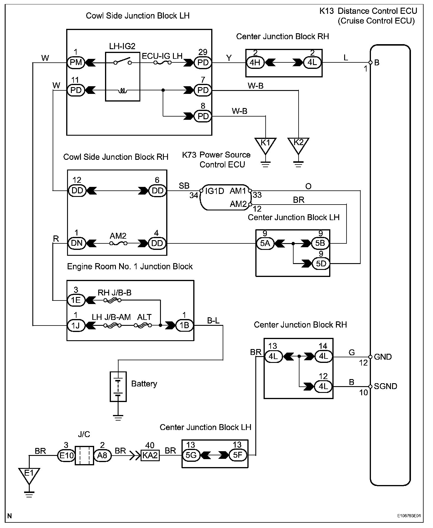 This circuit provides power to operate the distance control ECU (cruise control ECU). The distance control ECU determines information about the vehicle in front based on data from the radar sensor, and then decides how much acceleration and / or deceleration is needed to maintain the set distance. The distance control ECU also requests the skid control ECU to apply braking and sound the buzzer.