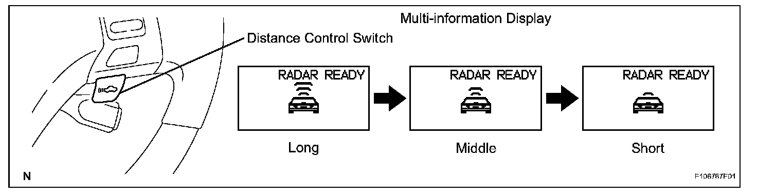 d. Check that the indication of the vehicle-to-vehicle distance, which is given in the multi-information display on the combination meter, changes from long to middle to short in that order.