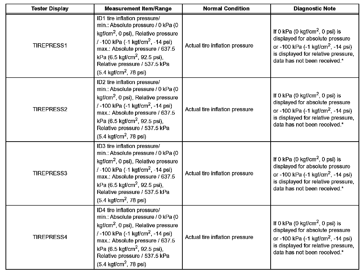 ^ The initialization is complete when the DATA LIST "TIREPRESS" display shows the correct pressures.