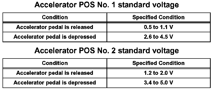 If the result is not as specified, check the accelerator pedal, wire harness or ECM.