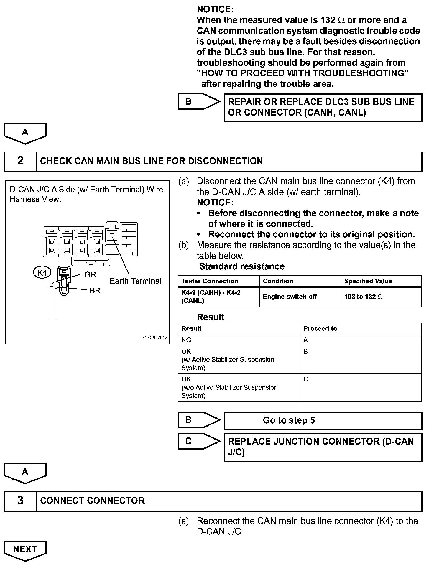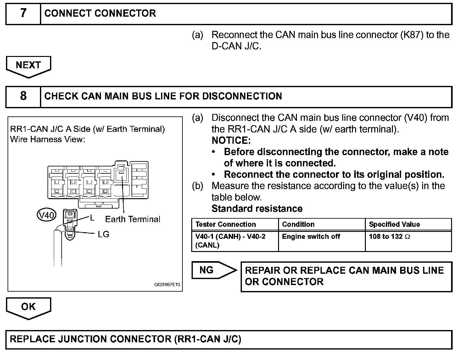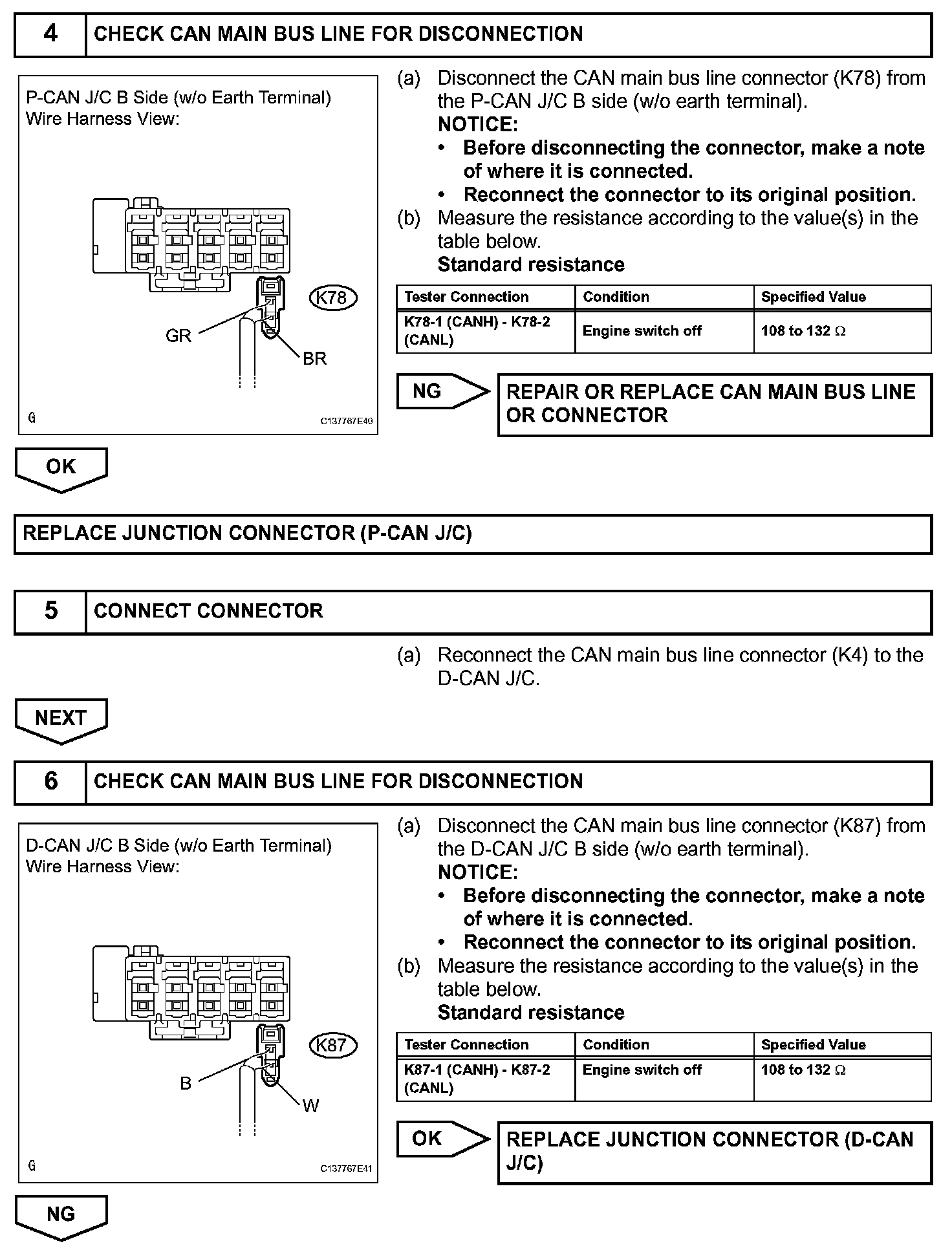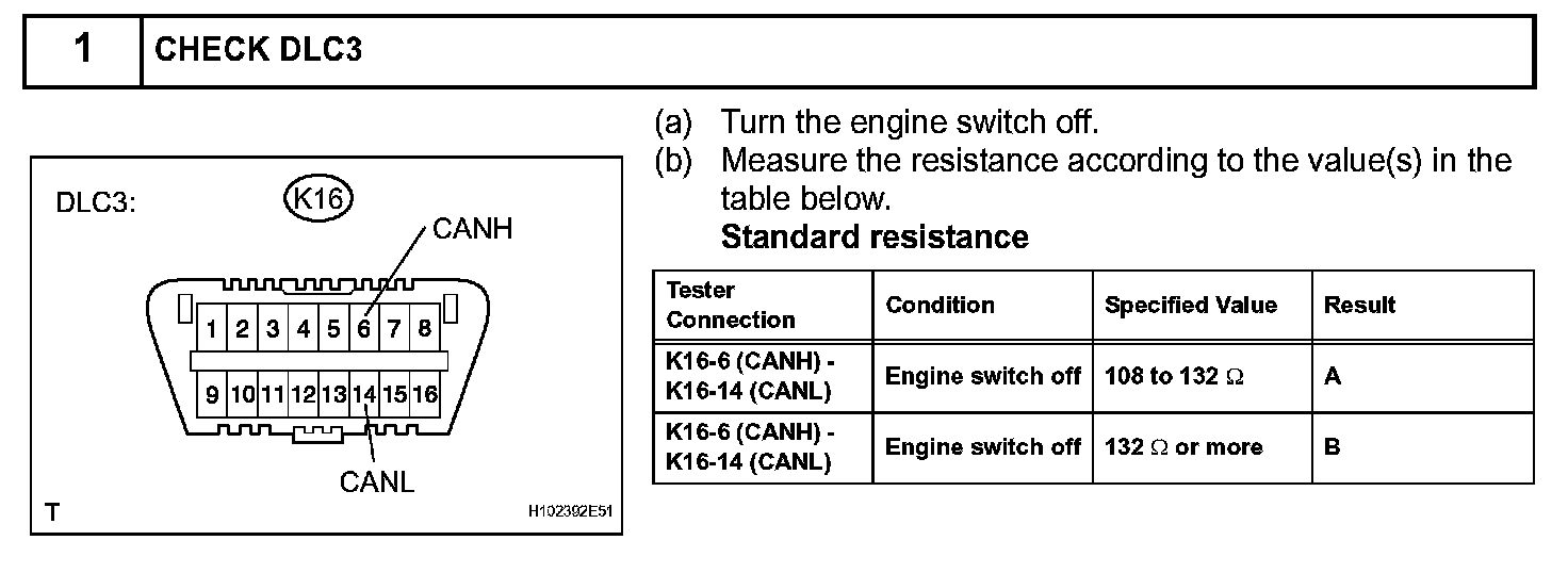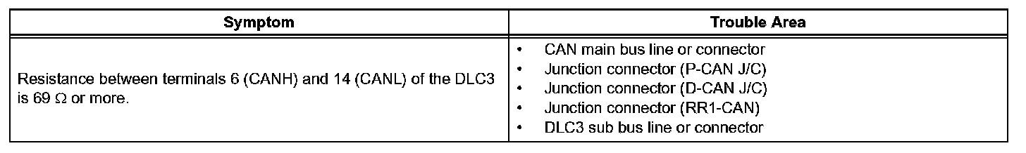 There may open circuit in the CAN main bus line and/or the DLC3 sub bus line when the resistance between terminals 6 (CANH) and 14 (CANL) of the DLC3 is 69 ohms or more.
