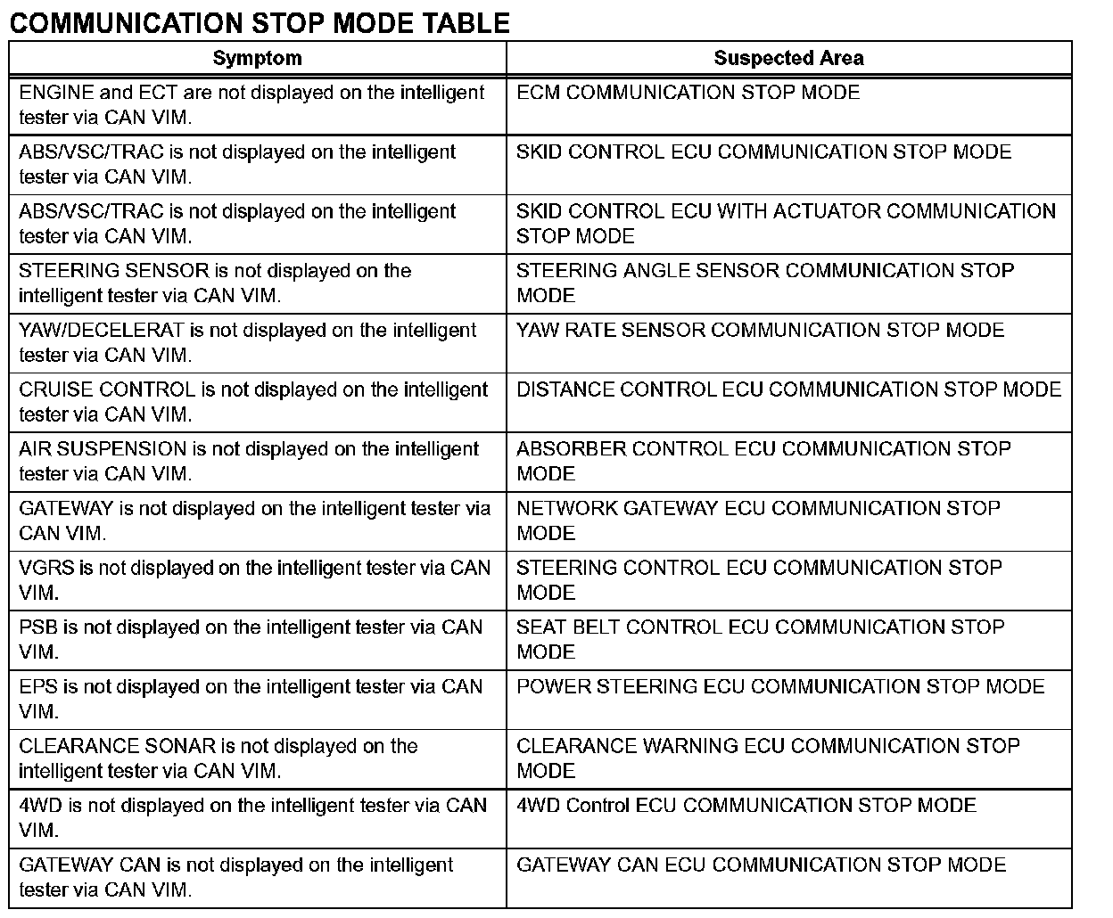 Problem Symptoms Table - Communication Stop Mode Table:
