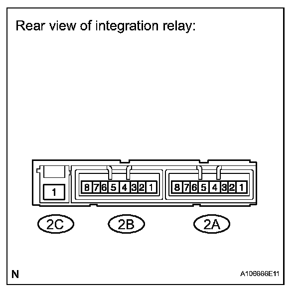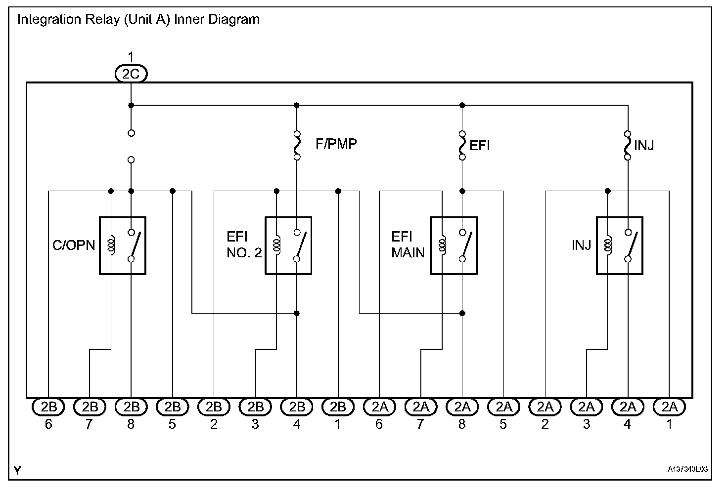 - The internal circuit of the integration relay is as shown in the illustration. Inspect the integration relay using the given procedures.