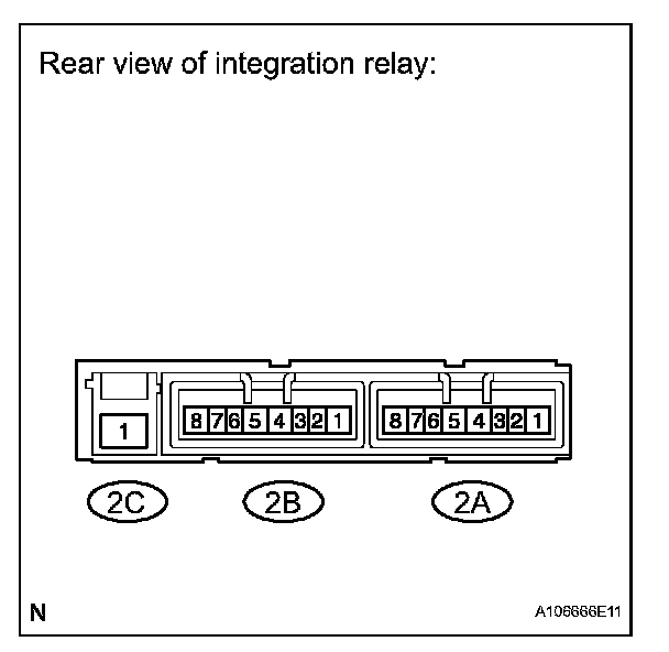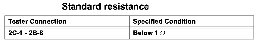 2. Connect the battery's positive (+) lead to terminals 2A-8 and 2C-1, and negative (-) lead to terminal 2B-3 and 2B-7. Measure the resistance between terminals 2C-1 and 2B-8 when battery voltage is applied between the terminals.
