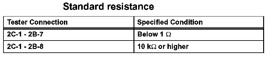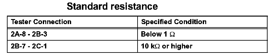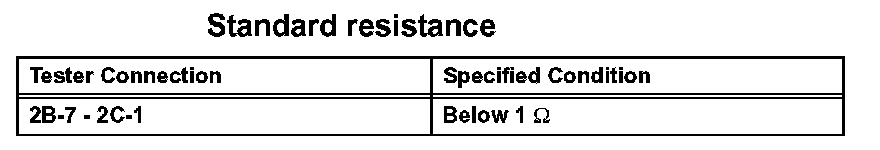 2. Connect the battery's positive (+) lead to terminal 2A-8 and negative (-) lead to terminal 2B-2. Measure the resistance between terminals 2B-7 and 2C-1 when battery voltage is applied between the terminals.