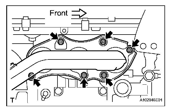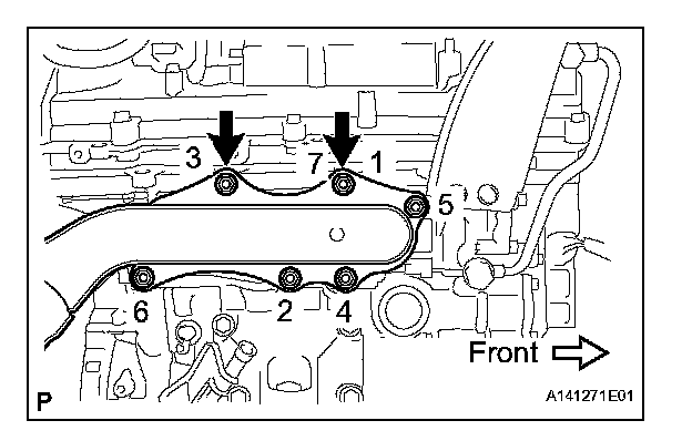 b. Install the exhaust manifold to the cylinder head with the 6 nuts in the order shown in the illustration.