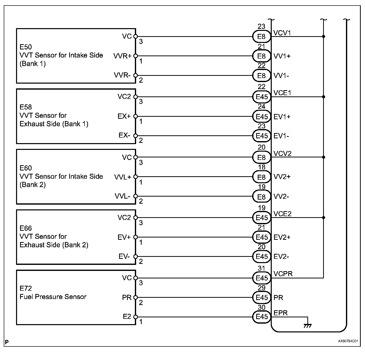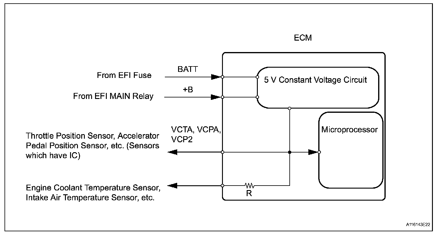 The ECM constantly generates 5 V power from the battery voltage supplied to the +B (BATT) terminal to operate the microprocessor. The ECM also provides this power to the sensors through the VC output circuit.