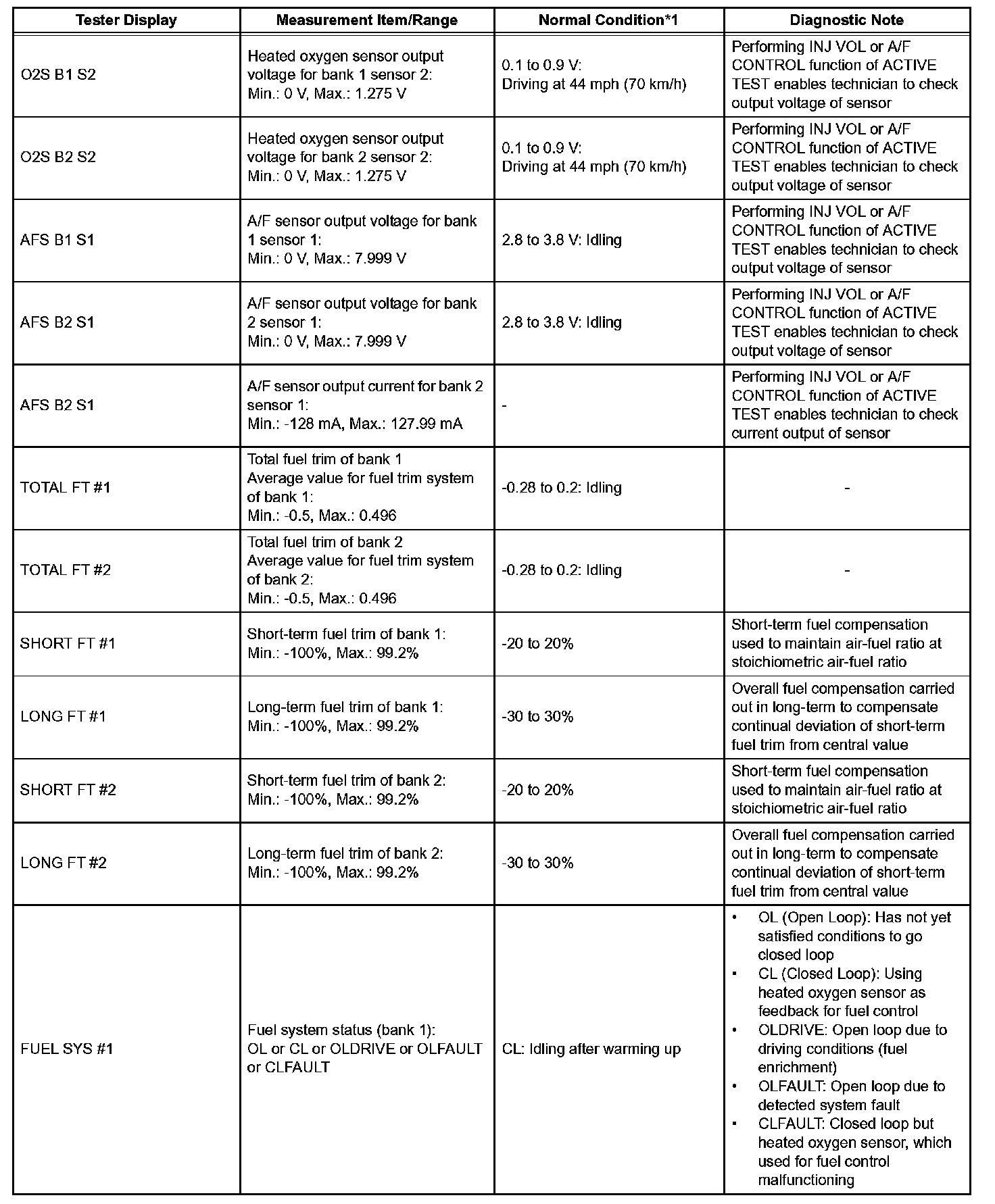 NOTE: In the table given, the values listed under Normal Condition are reference only. Do not depend solely on these values when determining whether or not a part is faulty.