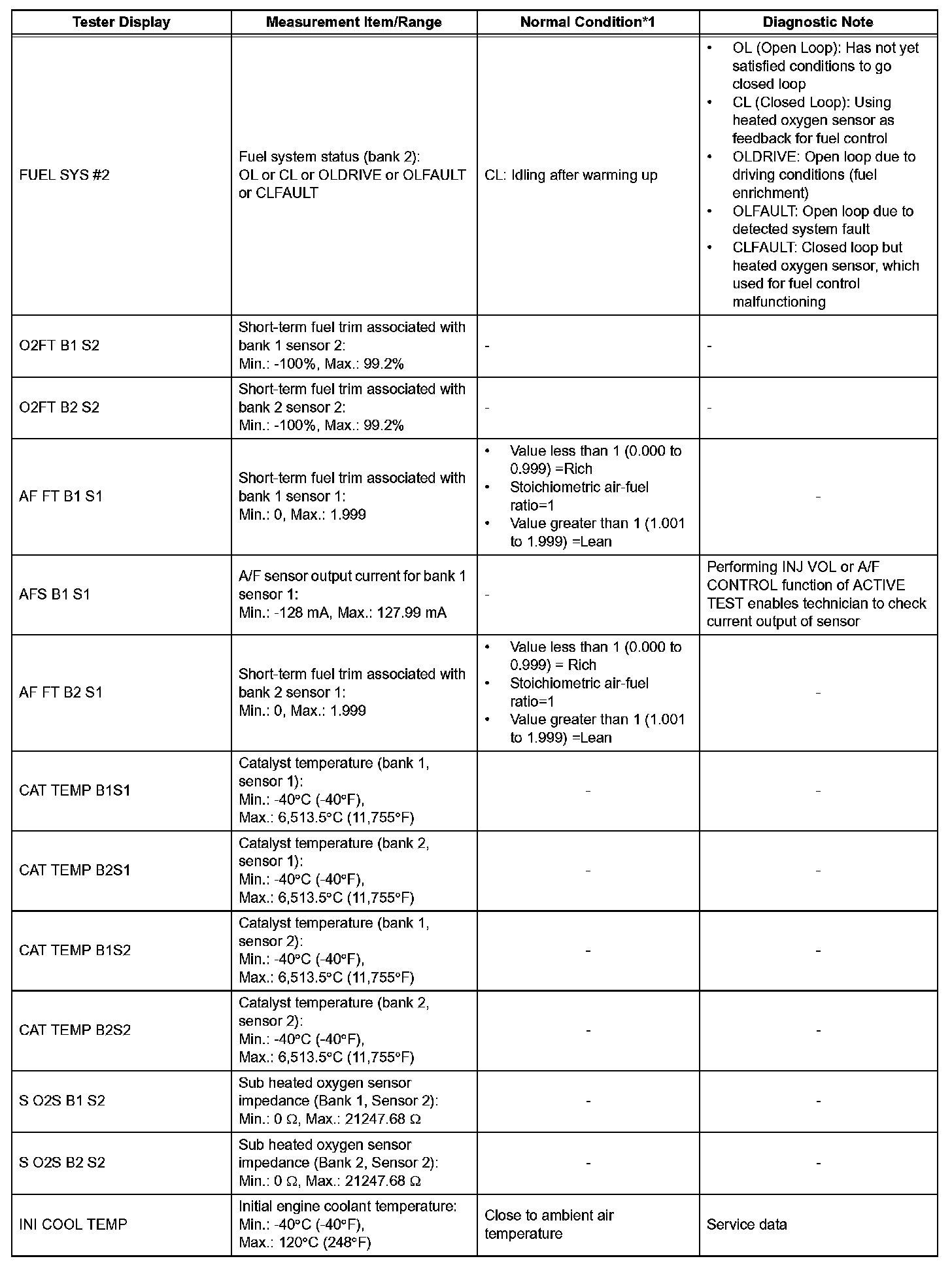 DATA LISTHINT: By reading the DATA LIST displayed on the intelligent tester, you can check values, including those of the switches, sensors and actuators, without removing any parts. Reading the DATA LIST as the first step of troubleshooting is one method of shortening diagnostic time.