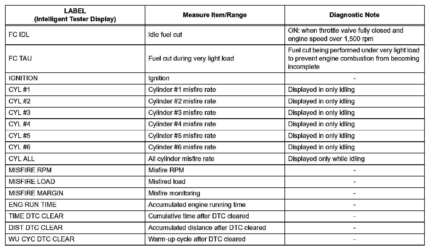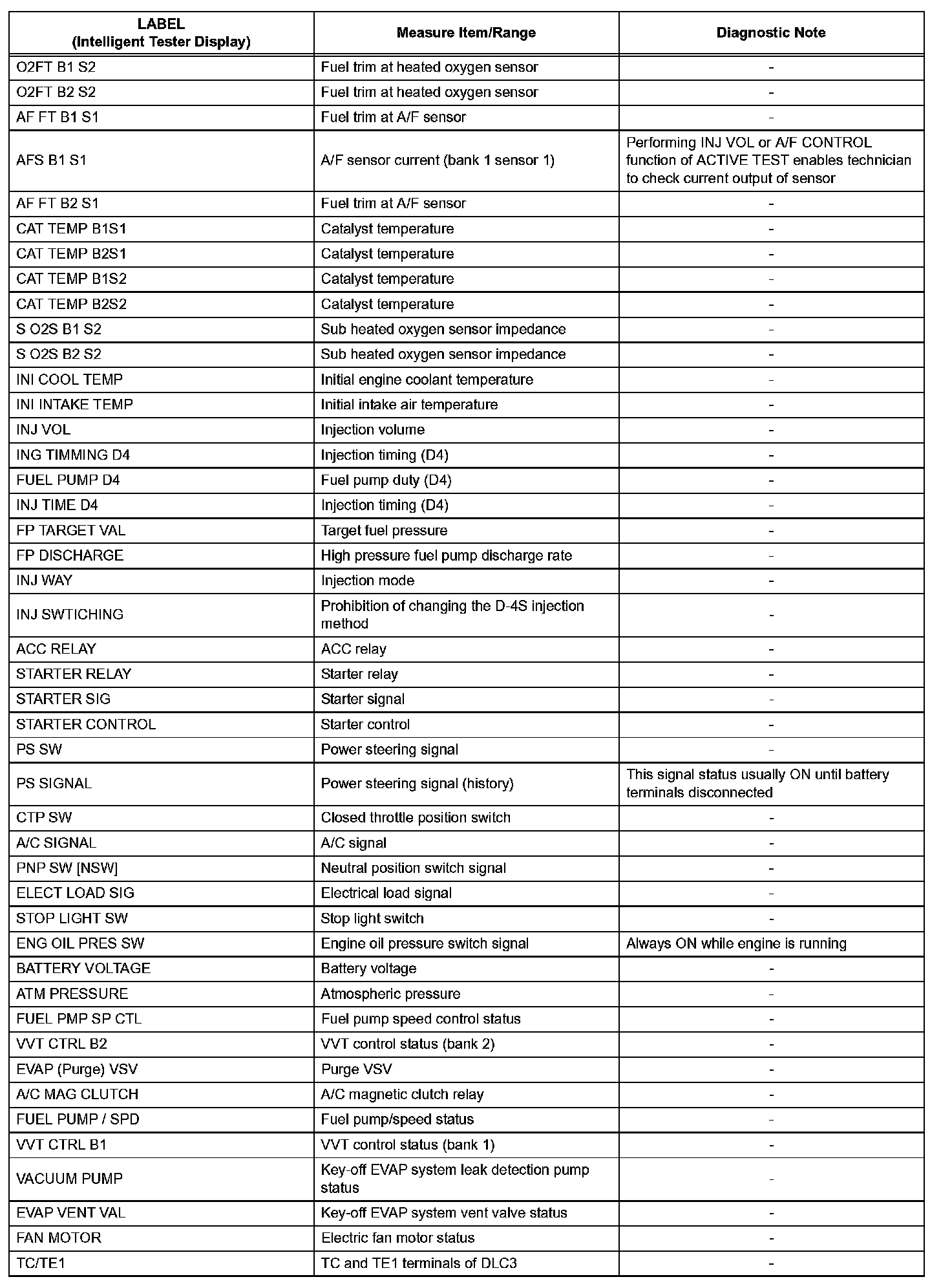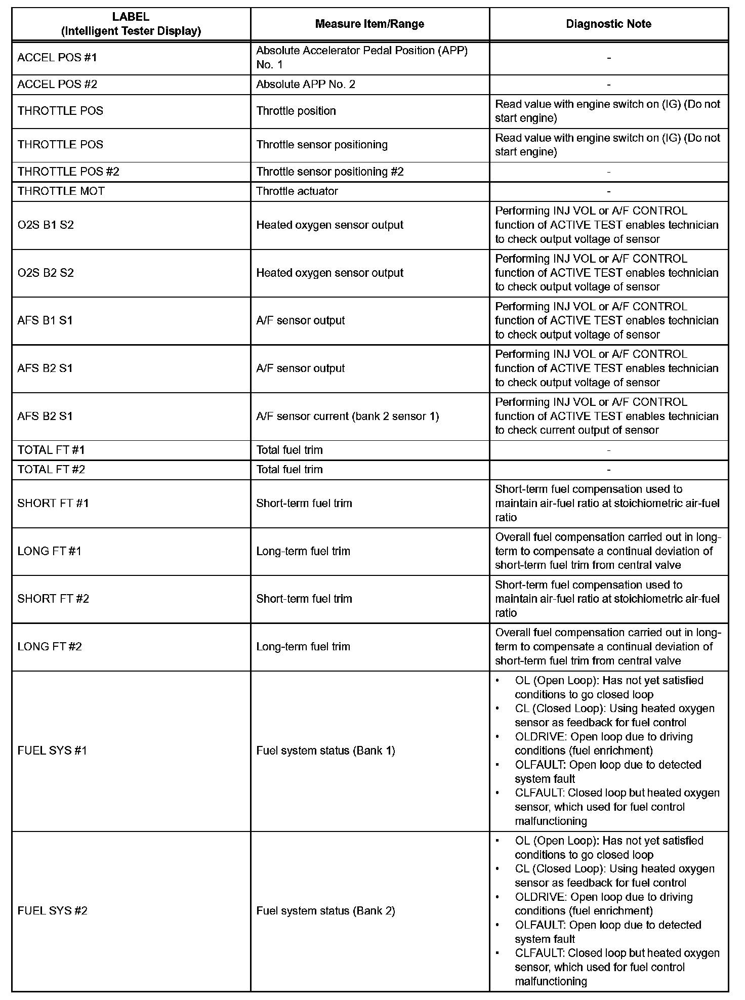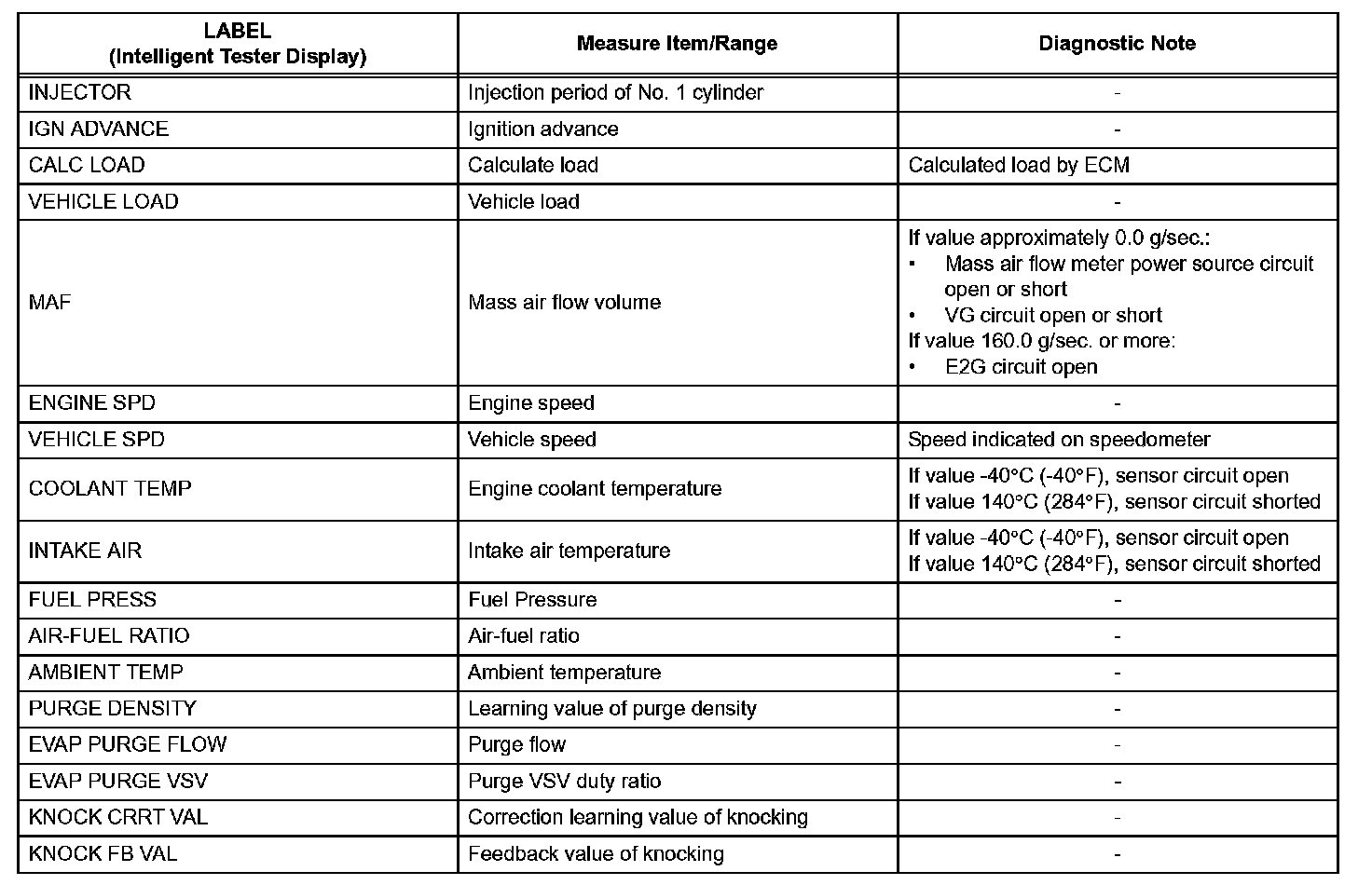 HINT: If it is impossible to replicate the problem even though a DTC is detected, confirm the freeze frame data. The ECM records engine conditions in the form of freeze frame data every 0.5 seconds. Using the intelligent tester, five separate sets of freeze frame data, including the data values at the time when the DTC was set, can be checked.