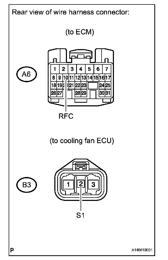 (a) Check the resistance of the wire harness between the ECM A6-10 (RFC) and cooling fan ECU B3-2 (S1).