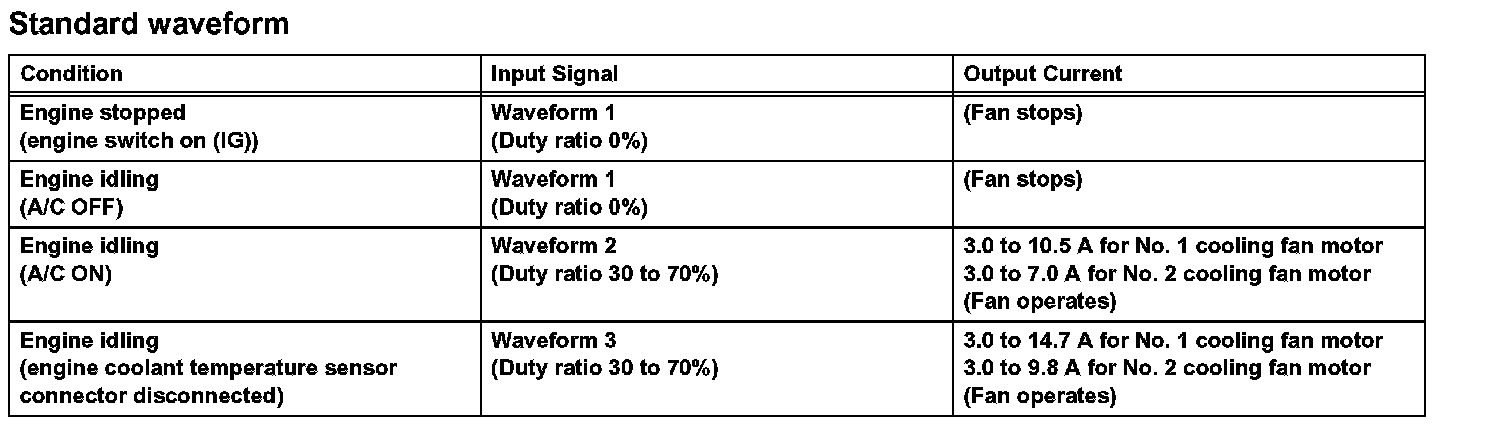^ If the output current is abnormal even when the input signal is normal, there is a malfunction in the cooling fan ECU (S1), cooling fan motor or power source circuit.