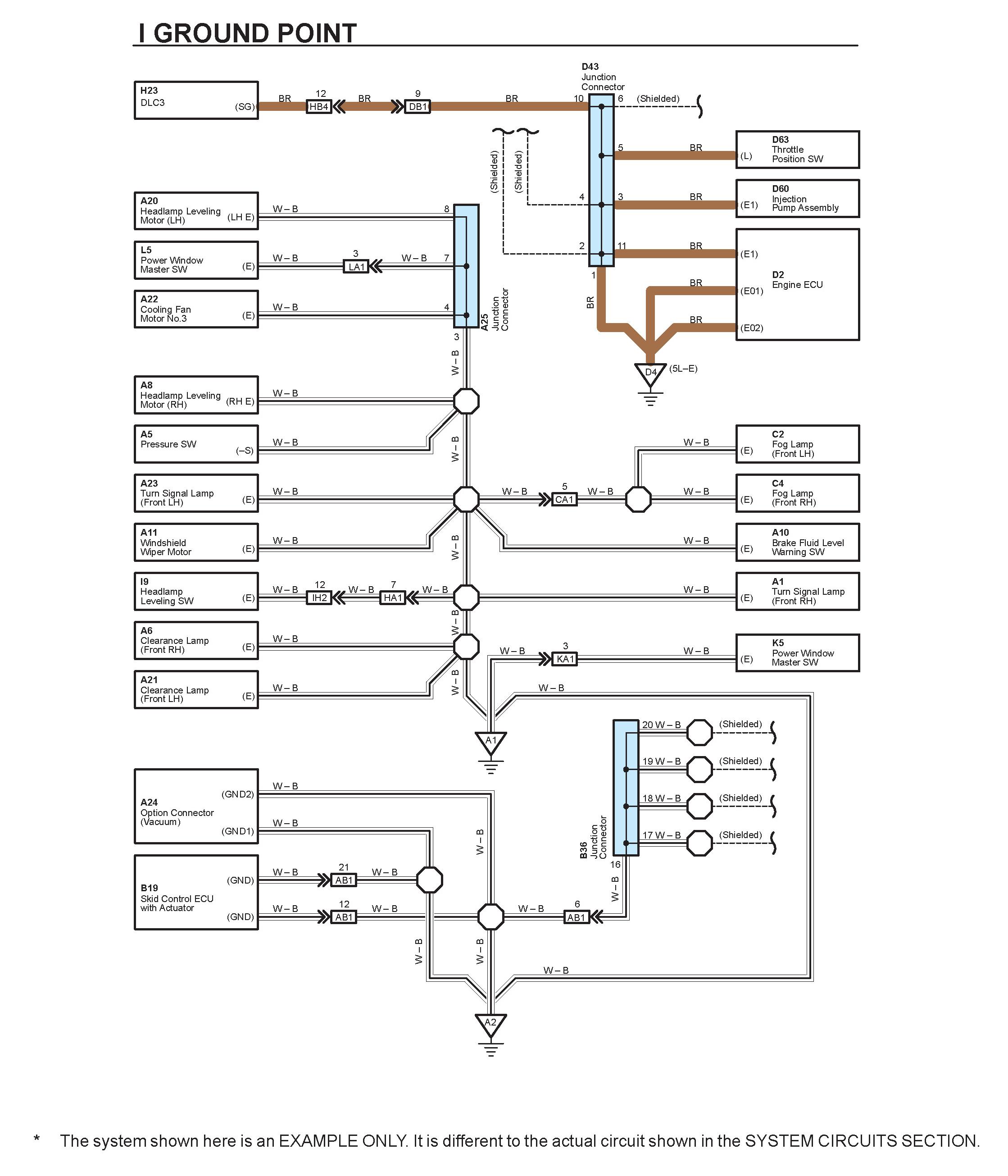 HOW TO READ GROUND POINTSThe ground points circuit diagram shows the connections from all major parts to the respective ground points. When troubleshooting a faulty ground point, checking the system circuits which use a common ground may help you identify the problem ground quickly. The relationship between ground points (A1, A2 and D4 shown) can also be checked this way.