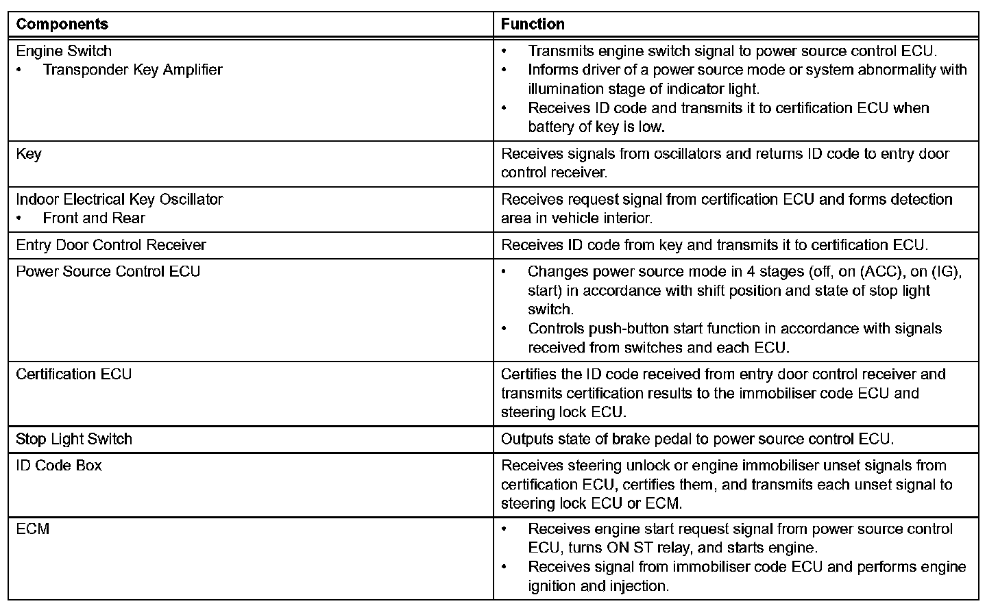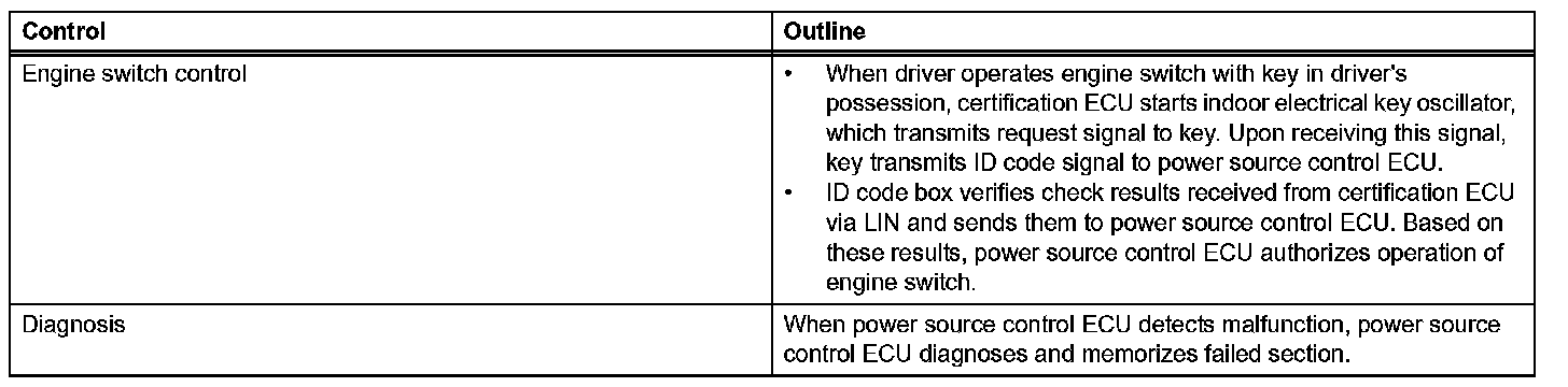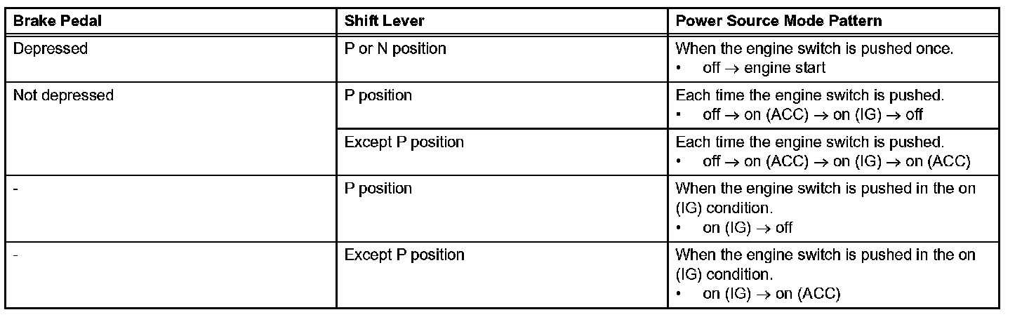 a. The push-button start uses a push-type engine switch, which the driver can operate by merely carrying the key. This system consists primarily of the power source control ECU, engine switch, ID code box, steering lock ECU, key, ACC relay, IG1 relay, IG2 relay and certification ECU. The power source control ECU controls the system. This function operates in cooperation with the smart access system. The table given shows the transition of the engine switch, which depends on whether the brake pedal is depressed or released.